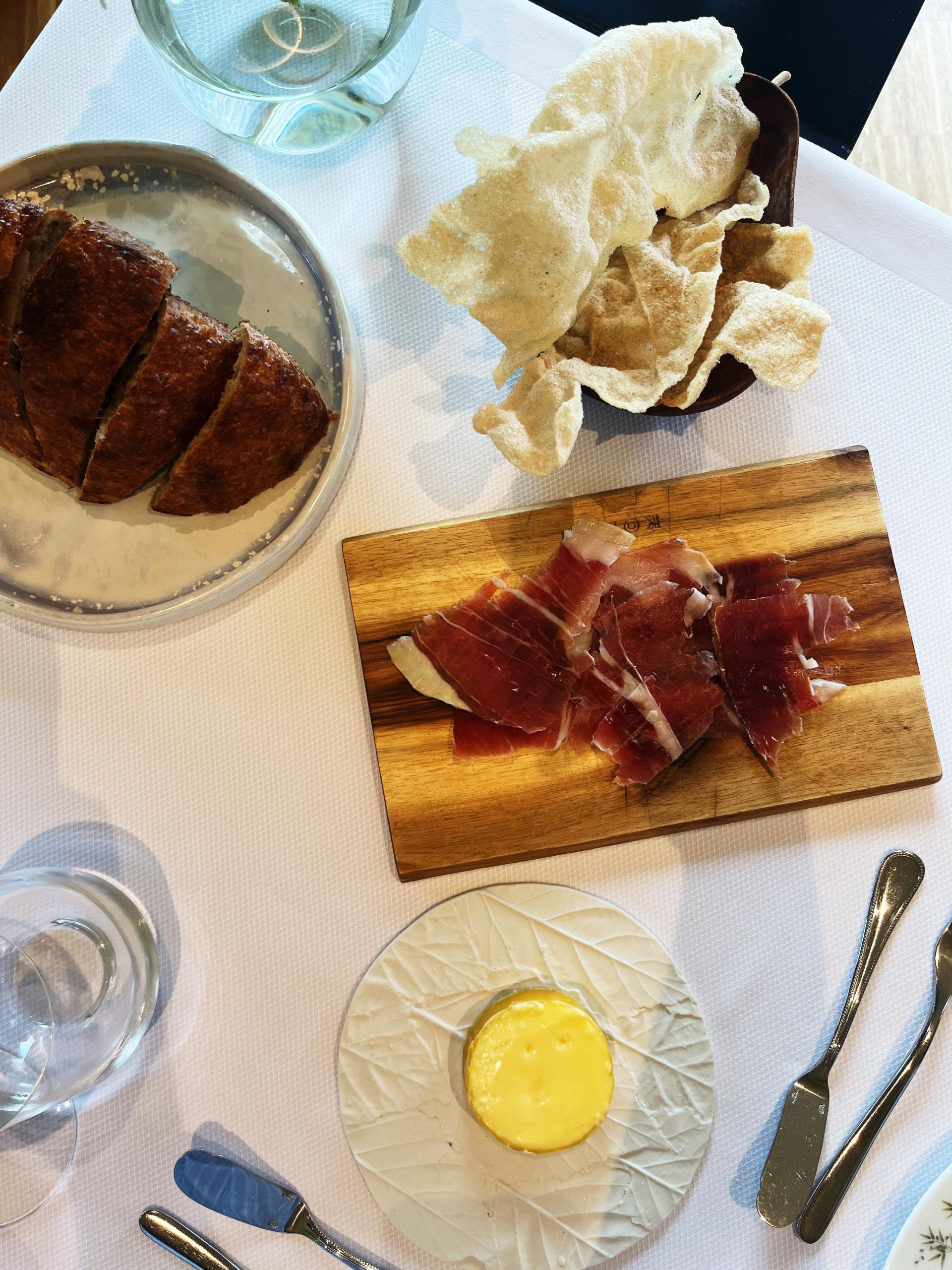 Ručak smo započeli domaćom šunkom koju obitelj Korak suši sama, i to dvije godine, domaćim kiselim kruhom fermentiranim 24 sata, krekerima od riže, maslacem i svježim sirom koji je još toga jutra napravila najmudrija članica obitelji Korak - baka Katarina. Krekere smo krenuli grickati prve i neprestano im se, u pauzama od ostalih zalogaja, vraćali. Bili su hrskavi, jednostavnog okusa, ali su toliko lijepo pucketali na jeziku da ih se nismo mogli zasititi. Kruh je, kao što smo to već i očekivali, bio odličan, pun okusa, blago kiselkast i prekrasnog, dubokog mirisa, i odlično se složio s kremastim domaćim maslacem i finom, slasnom šunkom. Ipak, tortica svježeg sira prelivena uljem od choriza bila nam je favorit. Svježi domaći sir pokazao je kako su najjednostavnije stvari nekada najbolje, ako se naprave s pažnjom. Cijela ideja ovog pozdrava iz kuhinje prilično nam se svidjela i rado bismo je ponavljali svakog jutra do kraja života, točno s ovim namirnicama i u ovoj formi.