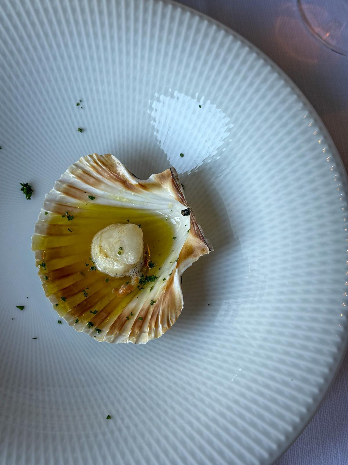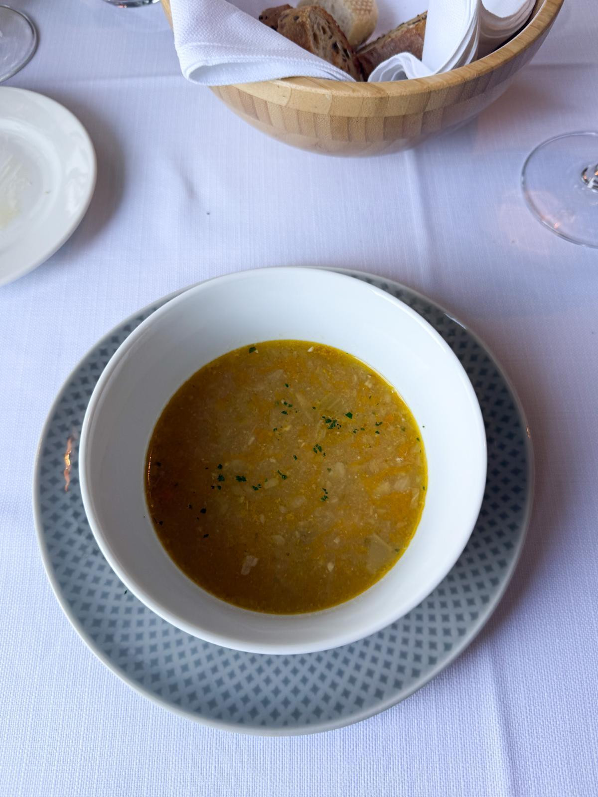 Potom su stigla dva topla zalogaja, svježe capesante na žaru (6 € komad). Vruće, aromatične, gotovo su pjevale s grilla. Vrlo bazično, ali fantastično. Ubrzo stiže i riblja juha (9,50 €), koju su nam također podijelili u dva tanjura. Nešto gušće teksture od prosjeka, s većom količinom svježeg povrća, bila je prava okrjepa. Lijek protiv teškog mamurluka. Uz juhu i capesante pili smo čašu prekrasne Piquentum Malvazije (7 €).