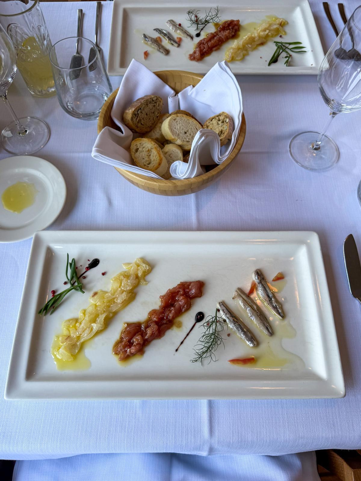 Započeli smo s čašom pjenušca Kabola Re Brut (6,45 €), sasvim ugodnog i s dugotrajnim perlanjem u čaši. Potom je za stol stiglo nekoliko manjih hladnih zalogaja. Carpaccio od orade (20 €) bio je iznimno delikatan, mekan i podatan. Uslijedili su čvrsti, bogati i svježi srebrni inćuni (9 €), a kao šećer na kraju – carpaccio od palamide (16 €). Prekrasan, gust i aromatičan, obogaćen tek s nekoliko kapi soja sosa. Hladna su nam predjela elegantno podijelili na dva tanjura.