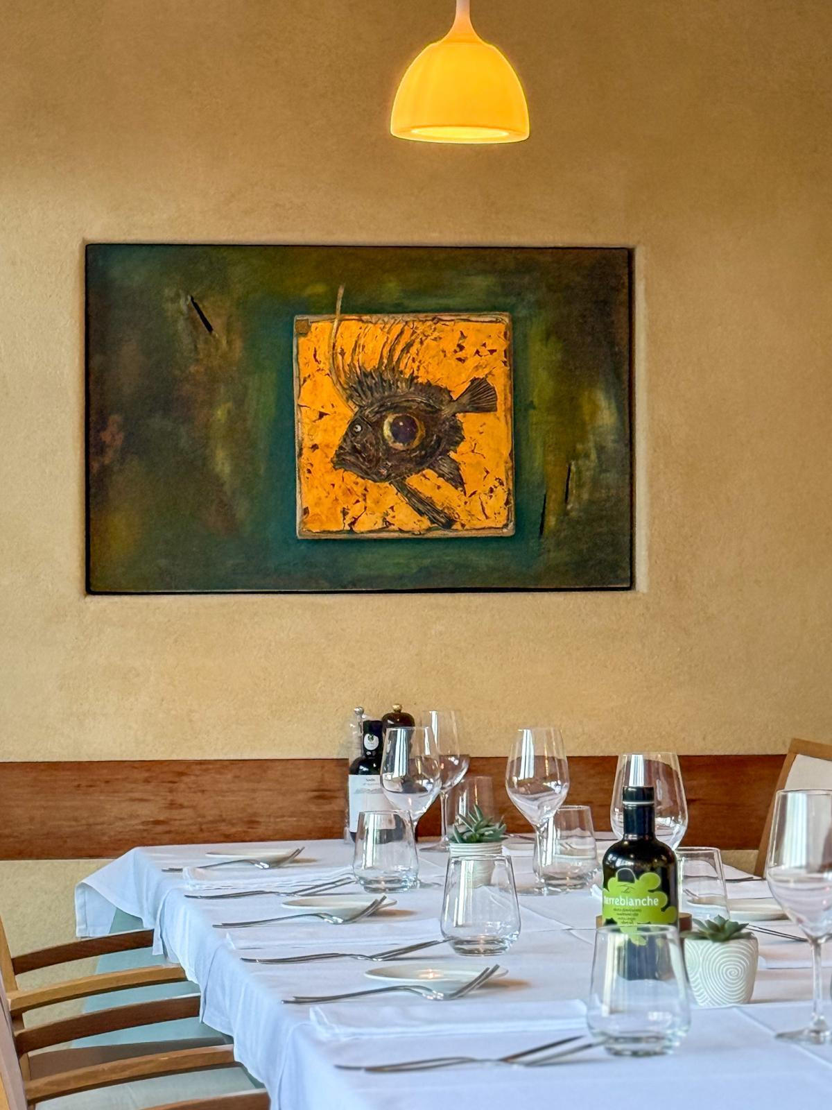 Na kraju, vrijedi spomenuti ugođaj u restoranu. Glazba je ugodna, gotovo neprimjetna, a pogled na more suptilan – jedva ga vidite krajičkom oka, ali znate da je tu i da vas gleda. Restoran je uređen moderno, s rustikalnim elementima i slikama na zidovima. Uza sve to, konobari su starinskoga kova, sveznajući i s iskrenim osmijehom koji je dovoljan da vas privuče natrag.