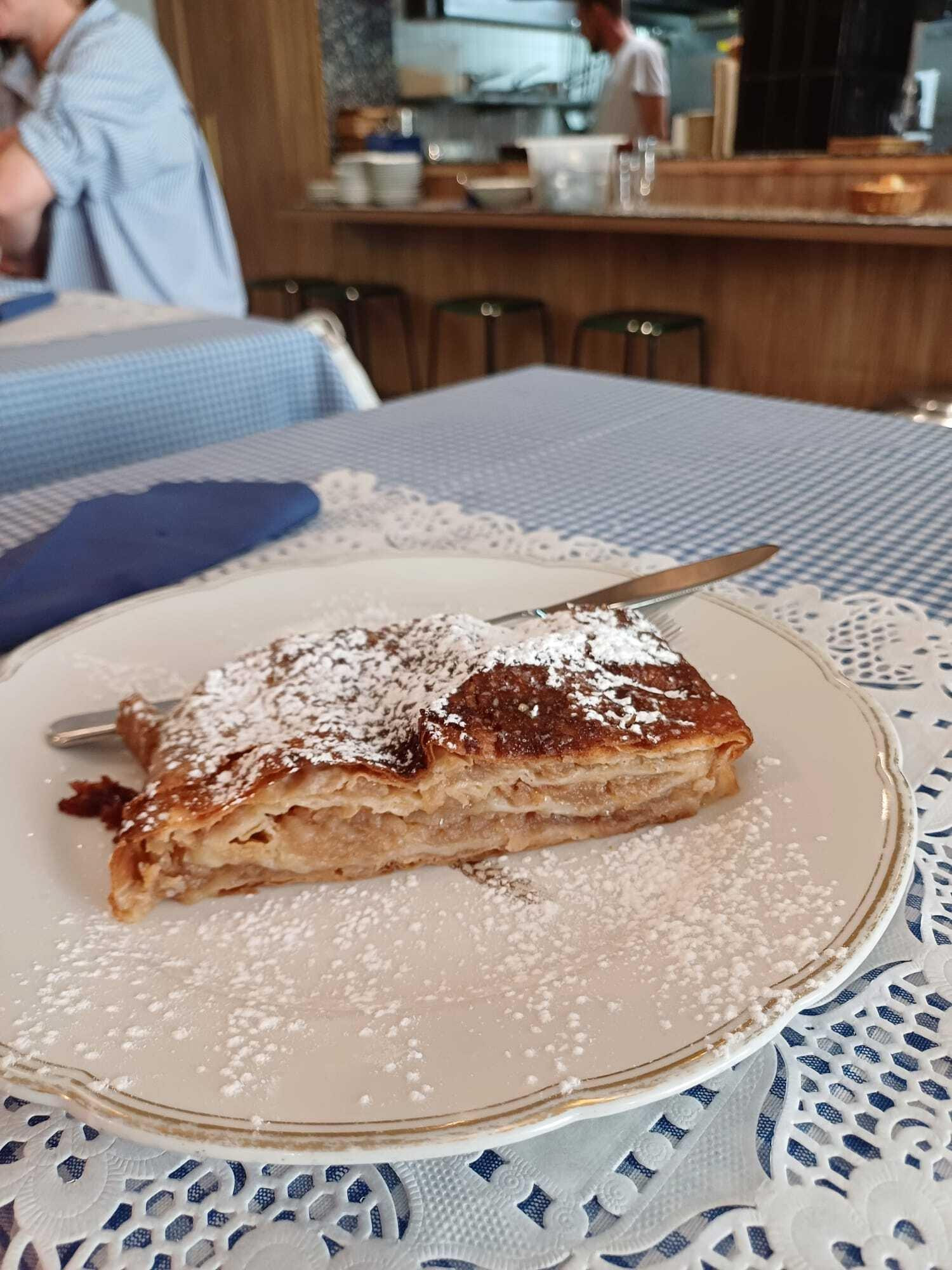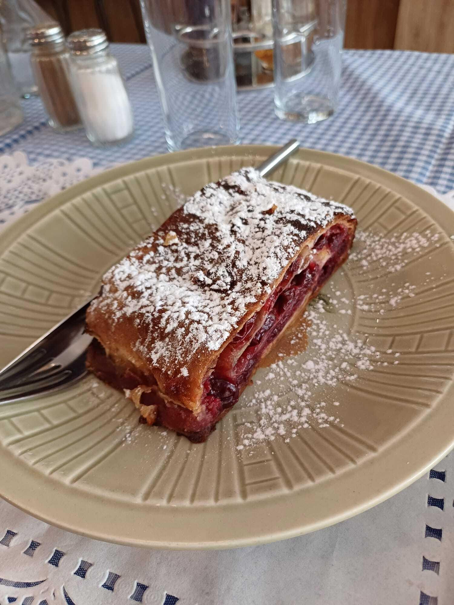 Osim tehničkih poteškoća, teško je progledati kroz prste za faux pas sa svježinom namirnica u restoranu koji se nalazi 57 metara od glavne zagrebačke tržnice. Na kraju smo uzeli dvije štrudle, jednu s jabukama i drugu s višnjama (4,20 €). Iako su obje bile malo prepečene, okusi su bili vrlo dobri. Jabuka nas je ugodno iznenadila, a višnja, iako tamnija i s drugačijim tijestom, bila je solidna.