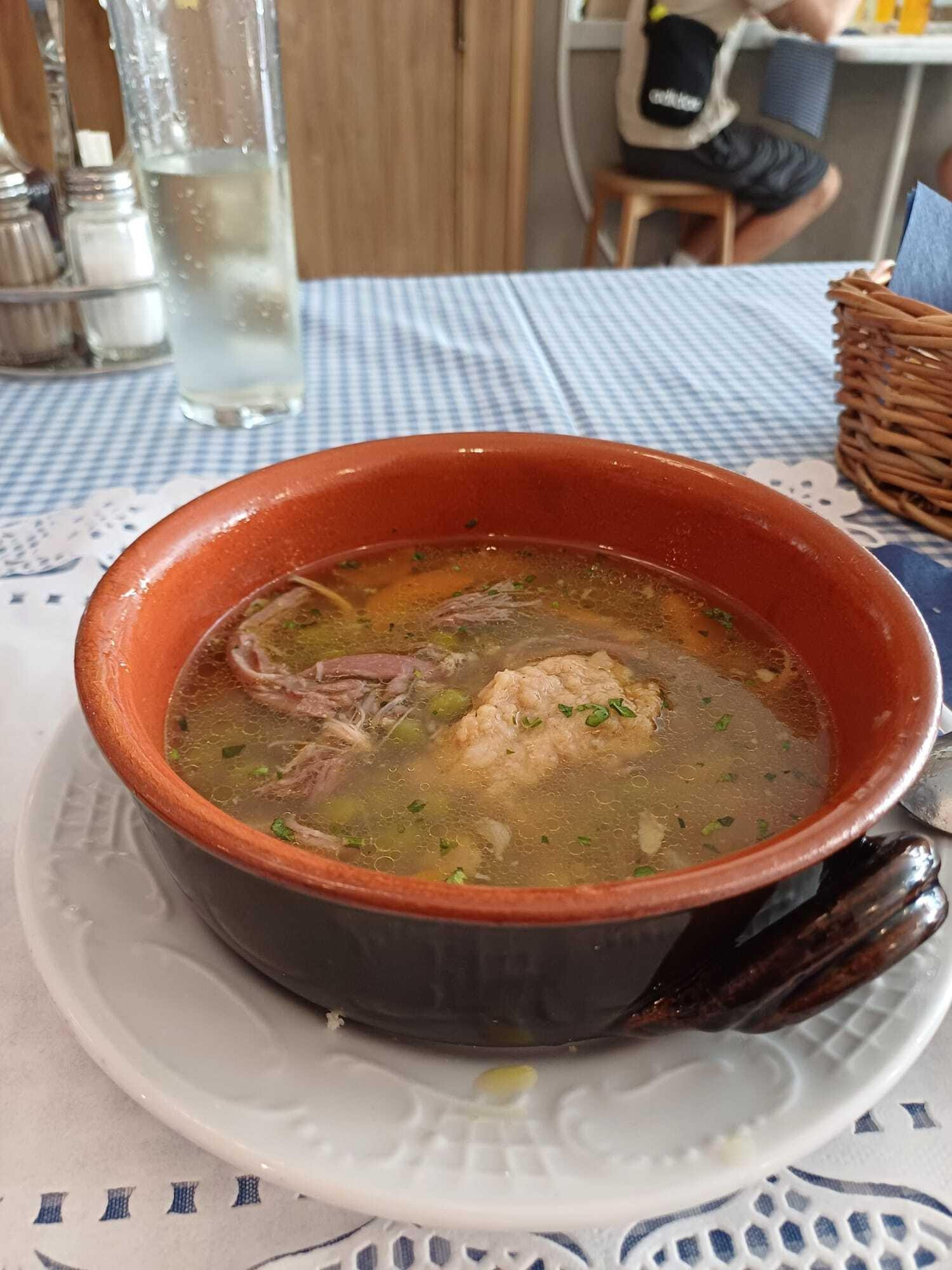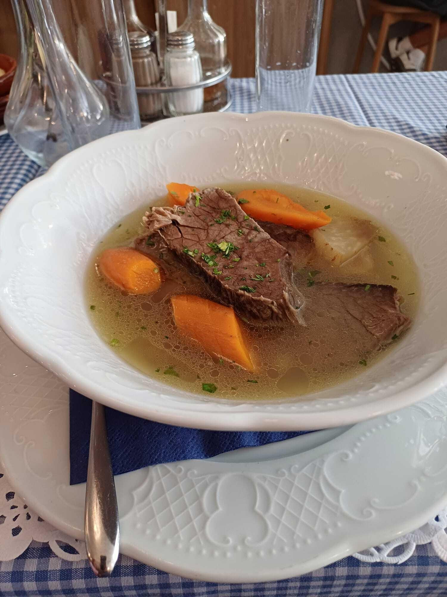 Za predjelo smo uzeli klasični zagrebački ajngemahtec (5,80 €), koji je bio vrlo ukusan, no primijetili smo razliku u odnosu na tradicionalnu verziju: nedostajala je blaga gustoća koju obično daje brašno i pileće iznutrice koje mu daju poseban štih. Također je bio malo preslan, ne dramatično, ali osjetno. Kruh koji smo dodatno naručili bio je izvrstan i očito domaći, što je pomoglo jer su knedlice iz juhe bile oskudne i zaboravljive.