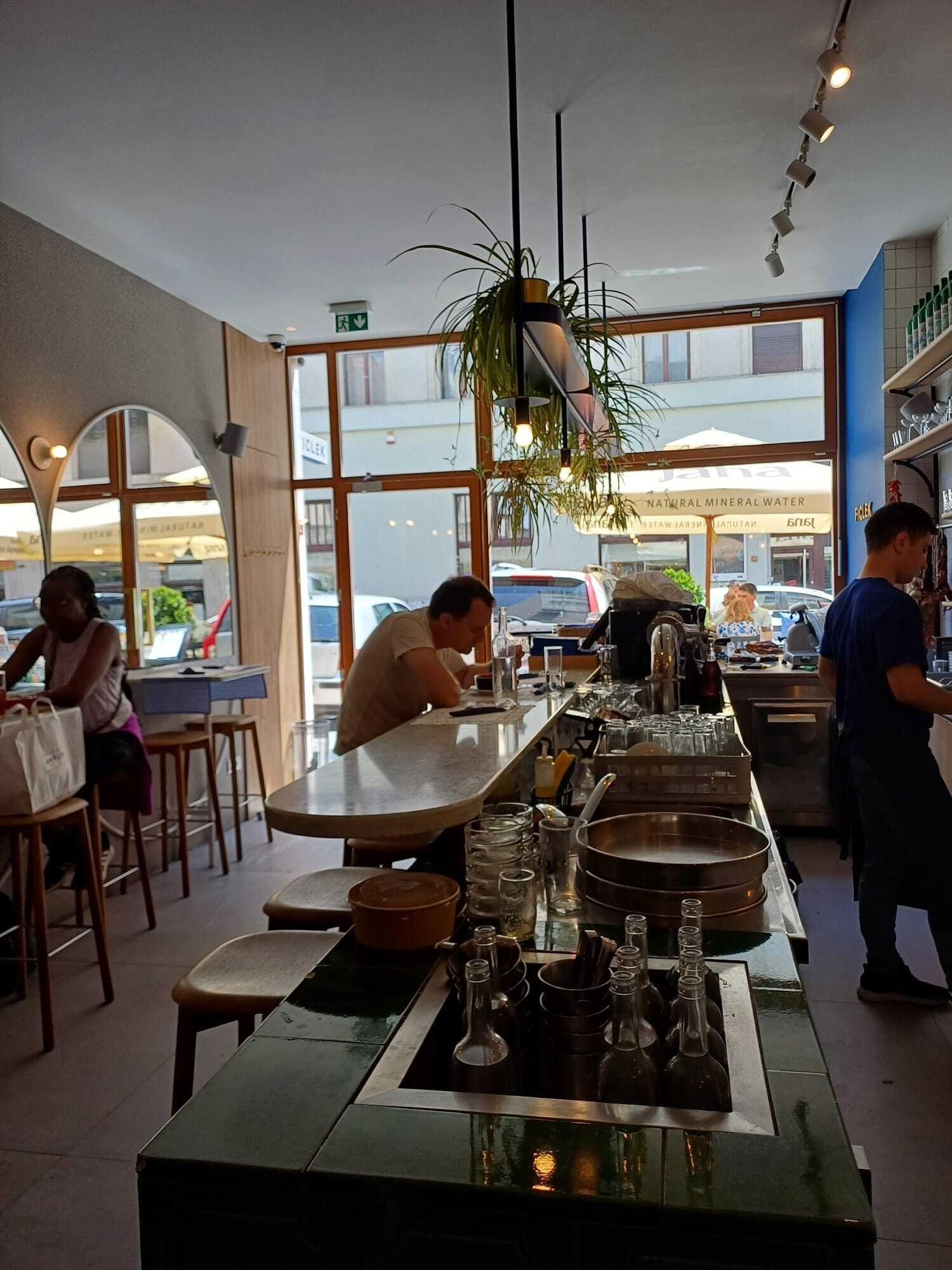 Posjetili smo Gostionicu Ficlek u Zagrebu za rani ručak. Stigli smo taman prije nego što je nastala gužva, pa smo odmah dobili stol unutra, dok je terasa već bila puna, osim nekoliko stolova na suncu. Unutrašnjost restorana odiše zagrebačkim retro šarmom: stari ormarići, slike, zanimljive pločice i detalji koji podsjećaju na stanove naših baka. Ogledala nasuprot šanku stvaraju dojam prostranosti u relativno malom prostoru, koji prima do 20-ak ljudi, uključujući i sjedeća mjesta na šanku. Svi stolovi i stolci unutra visoki su i prilično neudobni za dulje sjedenje, što je klasičan restoranski trik da se gosti ne zadržavaju predugo.