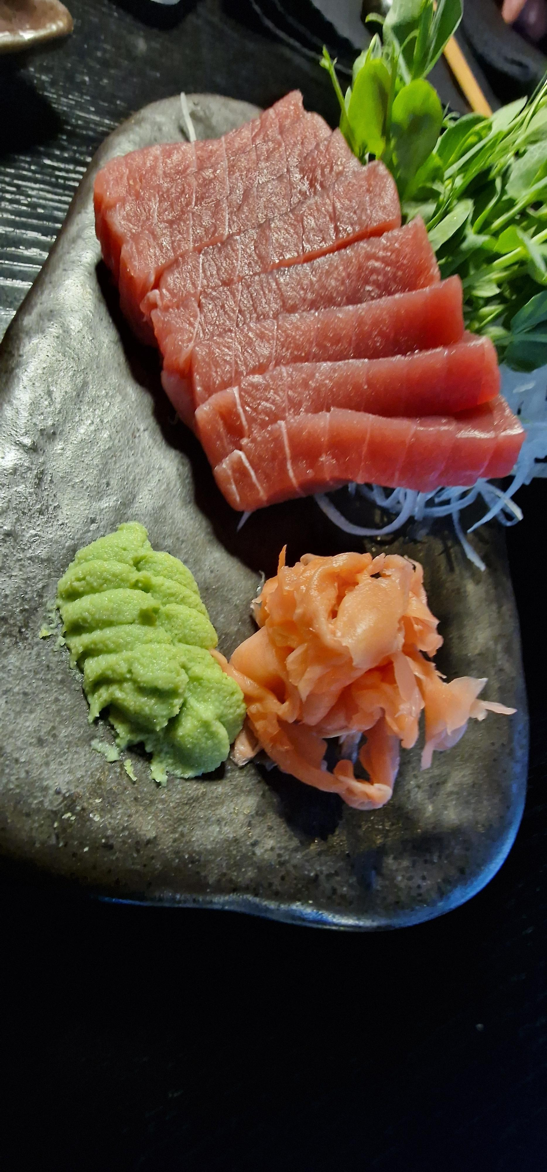 U nastavku večere, nakon početnih zalogaja, naručili smo i jela s tunom - preciznije, bluefin tekka hosomaki i sashimi od plavoperajne tune. Oba jela stigla su na tamnim keramičkim tanjurima minimalističkog dizajna, s dodatkom wasabija i mariniranog đumbira.