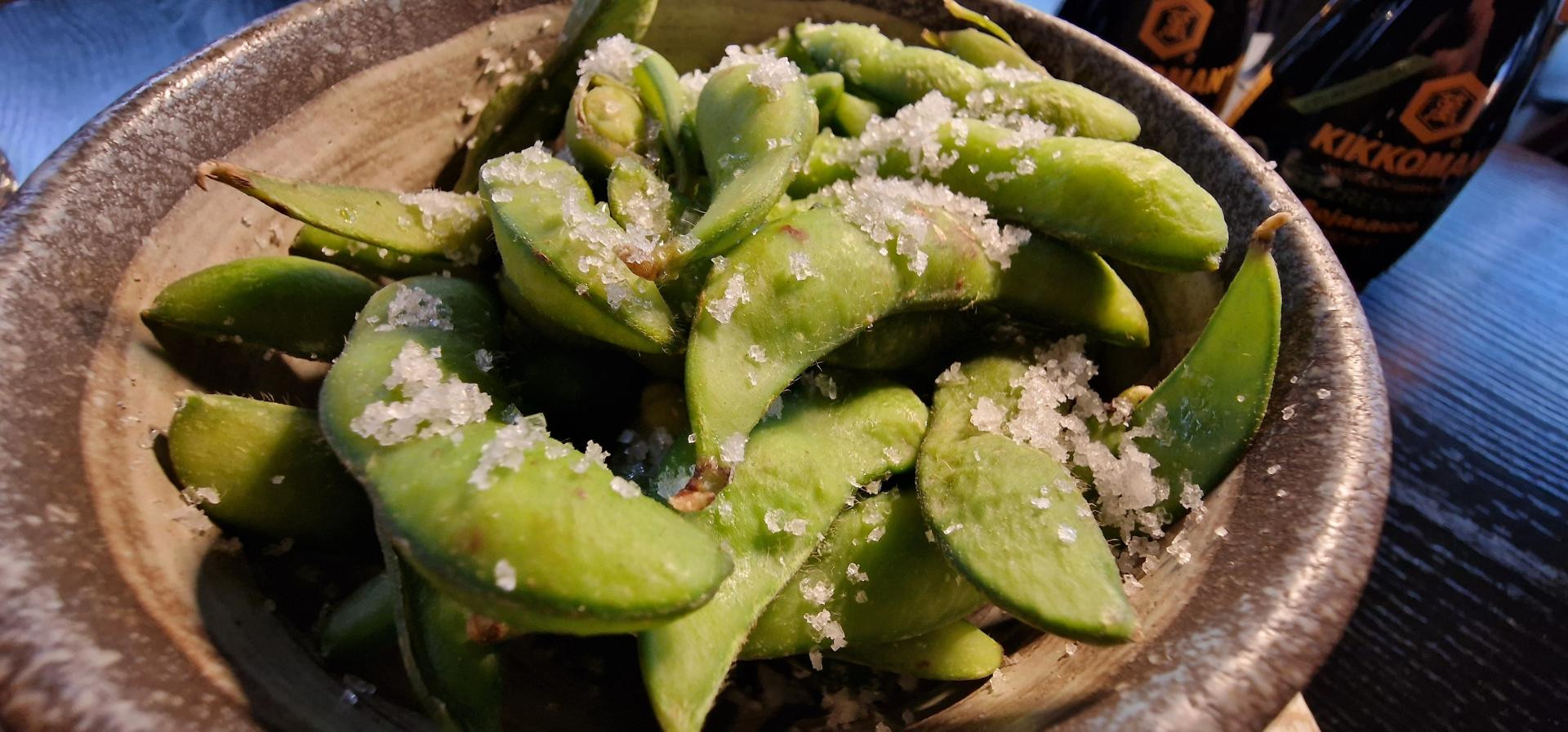 Prvo je stigao edamame - mlada zrna soje u mahunama, kuhana na pari i poslužena s cvijetom soli. Edamame je bio topao, pravilno kuhan i teksturalno vrlo ugodan, s blagom slatkastom i orašastom notom svojstvenom svježim, još nedozrelim sojinim bobicama. Na nekim mahunama pri vrhu činilo se da je soli bilo nešto previše, no opći dojam je i dalje vrlo dobar.
