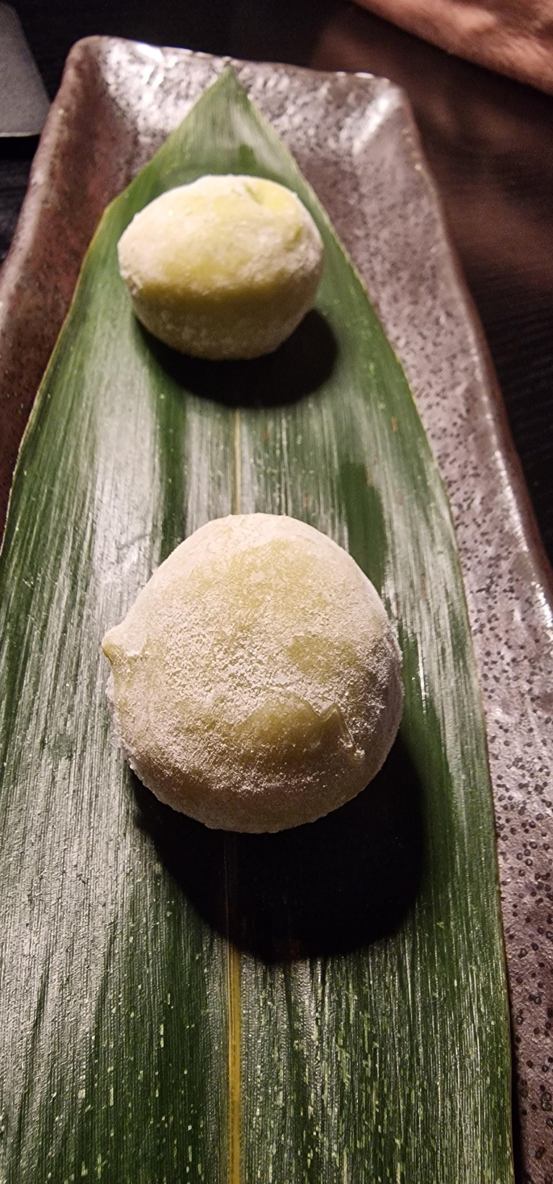Za desert smo uzeli mochi, tradicionalnu japansku slastica napravljenu od mekanog, ljepljivog rižinog tijesta s dodatkom matche. Blago slatkasta, s nježnom gorčinom i aromom matcha praha, ova delikatna kuglica skriva kremasto punjenje koje se topi u ustima. Posluženo na listu bambusa za autentičan doživljaj.