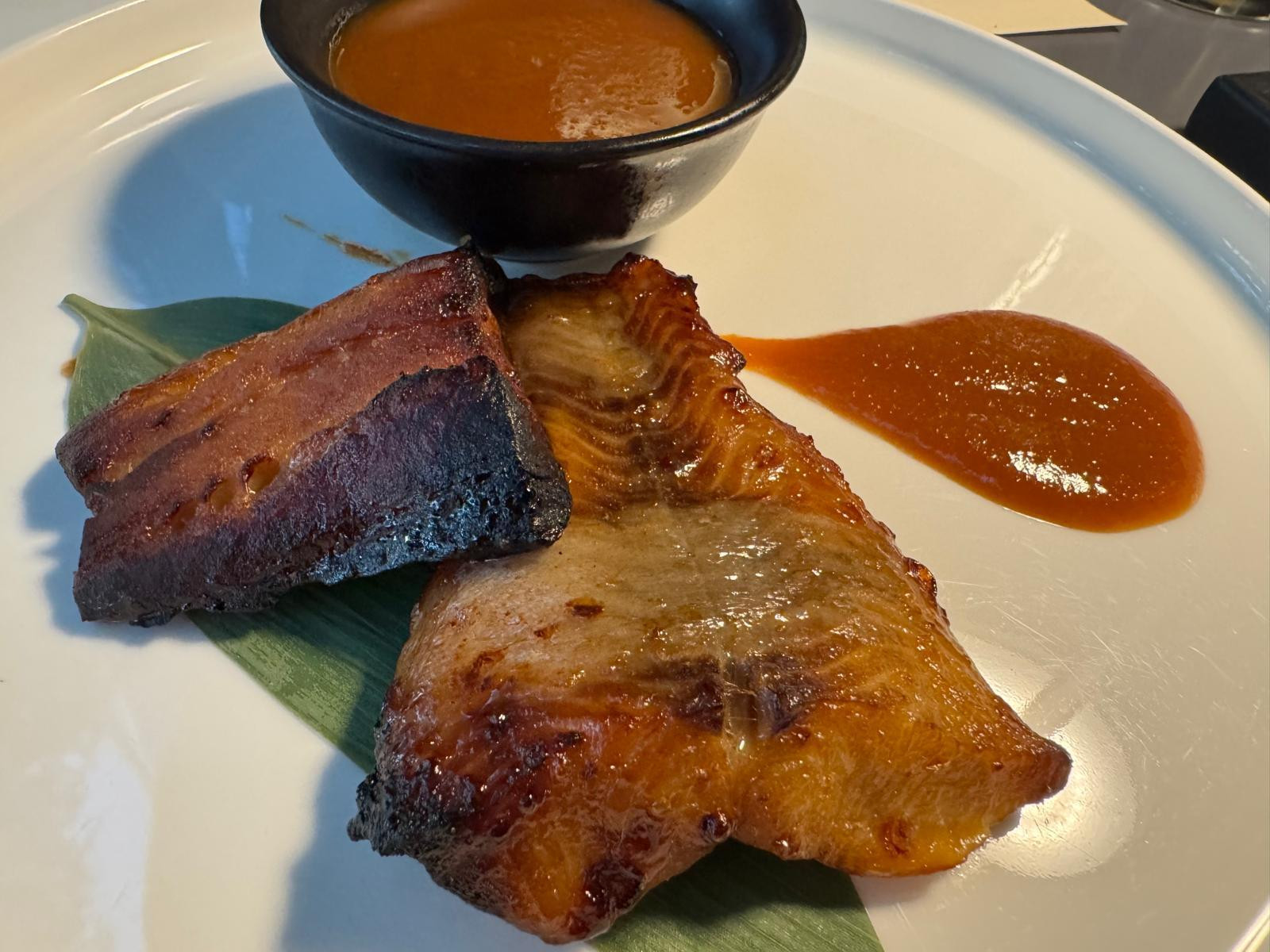 Kada smo prešli na New style i Nobu orbitu, odlučili smo se i za black cod. Ribu mariniranu u bogatoj miso glazuri od bijelog misa, mirina, sakea i šećera, što rezultira karakterističnom karameliziranom površinom tamno-zlatne boje i izraženim umami okusom. Ovdje je postignuta gotovo idealna tekstura: unutrašnjost je flaky i svilenkasta, gotovo kremasta, dok je vanjski sloj bogato karameliziran. Prezentacija slijedi japanske principe, minimalističke i čiste, bez nepotrebnih ukrasa. Poslužen na listu bambusa, uz zasebnu posudicu s miso umakom i dodatnu kap na tanjuru, jelo omogućuje gostu da sam balansira intenzitet okusa. Ipak, određene nijanse ostavljaju prostor za poboljšanje. Komad ribe vizualno je i strukturalno tanji od idealnog, vjerojatno kraj filea, bliže repu, gdje je masnoće manje, a meso brže gubi vlagu. To djelomično utječe na ujednačenost teksture i sočnost u svakom zalogaju. Osim toga, uočljiva je neujednačena karamelizacija pojedini dijelovi tamniji su i gotovo izgoreni, Zaključno, tehnički solidno izvedeno jelo koje poštuje tradiciju i zadržava vizualnu i okusnu autentičnost, no upotreba tanjeg i potencijalno manje reprezentativnog dijela filea sprečava ga da u potpunosti zasja.