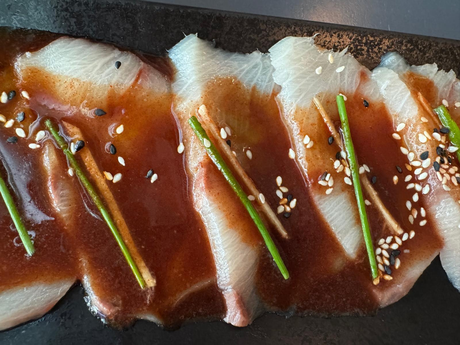 Odlučili smo se uz nigiri probati i New Style Sashimi. Jelo nastalo krajem 1980-ih u restoranima chefa Nobua Matsuhise, koji je htio približiti tradicionalni japanski sashimi zapadnjačkom nepcu. Tehnika kratkog "kuhanja" sirove ribe vrućim uljem, nakon čega se prelijeva aromatičnim umakom na bazi soje, citrusnih sokova i začina, revolucionirala je način serviranja sirove ribe izvan Japana. Ideja je bila stvoriti jelo koje zadržava svježinu sashimija, ali s dodatnom dimenzijom okusa koju donosi topli umak. Ovaj New Style Sashimi od jadranskog gofa predstavlja uspješnu domaću verziju japanske klasike. Gof, ribа karakteristične nježne teksture i diskretnog okusa, odlično prima tretman vrućim uljem koji mu daje površinsku karamelizaciju, zadržavajući sirovu unutrašnjost. Umak je i ovdje glavni protagonist, što je i trebao biti. Kombinacija soje s citrusnim notama i promišljeno doziranom ljutinom stvara kompleksan okus koji ne prikriva, već definira jelo. Gof služi kao savršena podloga koja upija aromat, a njegova nježnost omogućava da umak dođe do izražaja bez agresivnosti. Prezentacija s posipom sezama i svježim vlascem dodaje vizualnu i tekstualnu dimenziju. Jelo pokazuje kako se tradicionalne tehnike mogu uspješno adaptirati na lokalnu ribu uz poštivanje izvornog koncepta.