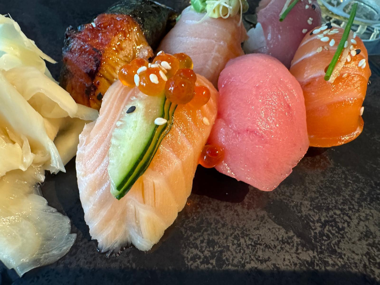 Nakon uvoda prešli smo na ono što nas najviše asocira na japansku kuhinju, a to je sirova riba. Kroz tanjur selekcije nigirija napravili smo putovanje kroz različite teksture i okuse sirovog i lagano pripravljenog morskog ploda, od bogatog unagija do delikatne tune, svaki komad priča svoju priču. Unagi nigiri, tamno, sjajno meso slatkovodne jegulje, prožeto tare umakom, donosi duboke karamelne note koje podsjećaju na teriyaki glazuru. Tekstura je posebna, podatna, gotovo maslačna, dok slatkasto-slan okus ostaje dugo na nepcu. Riža ispod je mlaka i savršeno začinjena, čineći solidnu osnovu koja ne konkurira glavnoj ulozi.