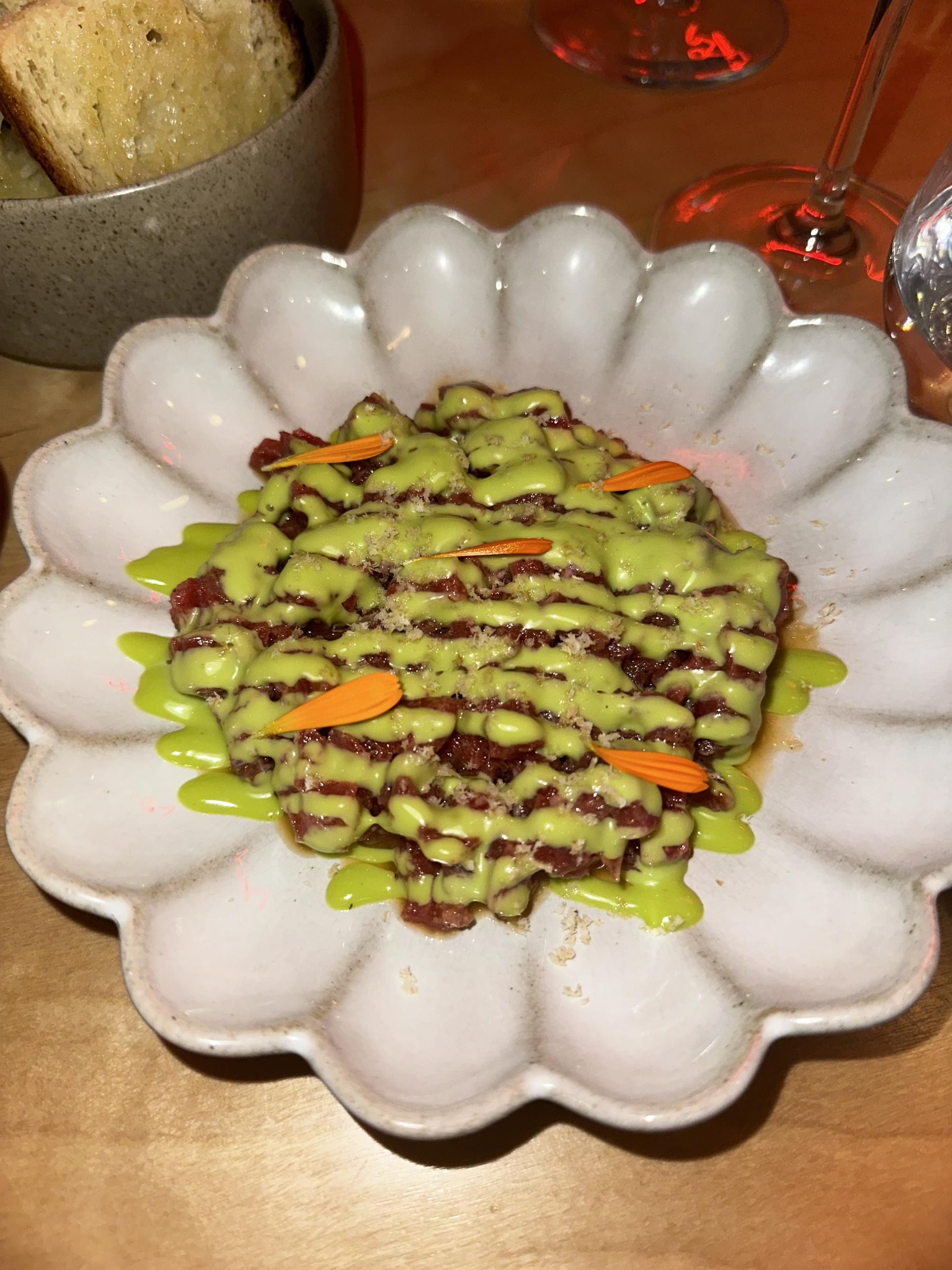 Večeru smo započeli s beef tartarom s majonezom od estragona i hrenom (19,50 €). Tekstura mesa je bila ugodna, začinjenost vrlo odmjerena – bez agresivnih začina. No, jelo nas nije potpuno uvjerilo. Možda je krivac bio sourdough kruh koji je bio iznenađujuće slan, ili činjenica da se hren gotovo nije osjetio. Majoneza je bila divna, ali sve skupa kao da je vapilo za svježinom - kiselinom, nečim što će probuditi tanjur.