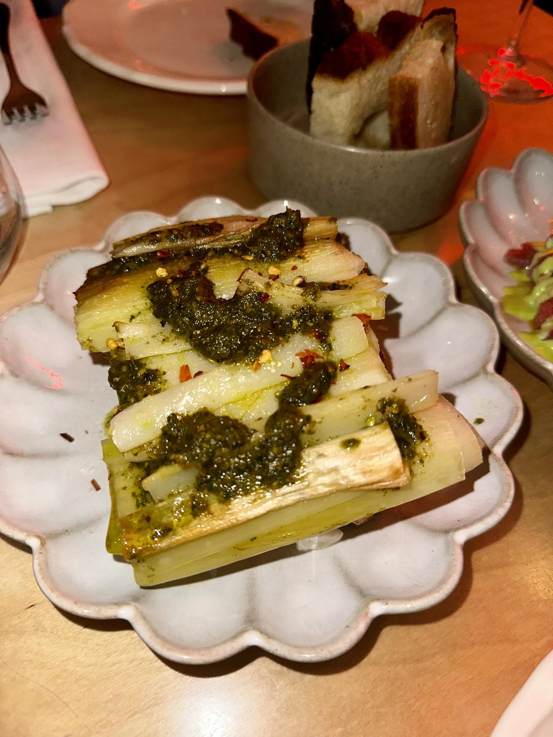 Pečeni poriluk na kiselom kruhu s tučenom ricottom, pestom od pistacija i maslinovim uljem zvuči kao jelo s karakterom (15 €), no na tanjuru je dojam bio nešto skromniji. Poriluk je karameliziran i divno sladak, ali teško se grize. Ricotta nježna, možda i previše. Falilo je odlučnosti, konkretnosti.