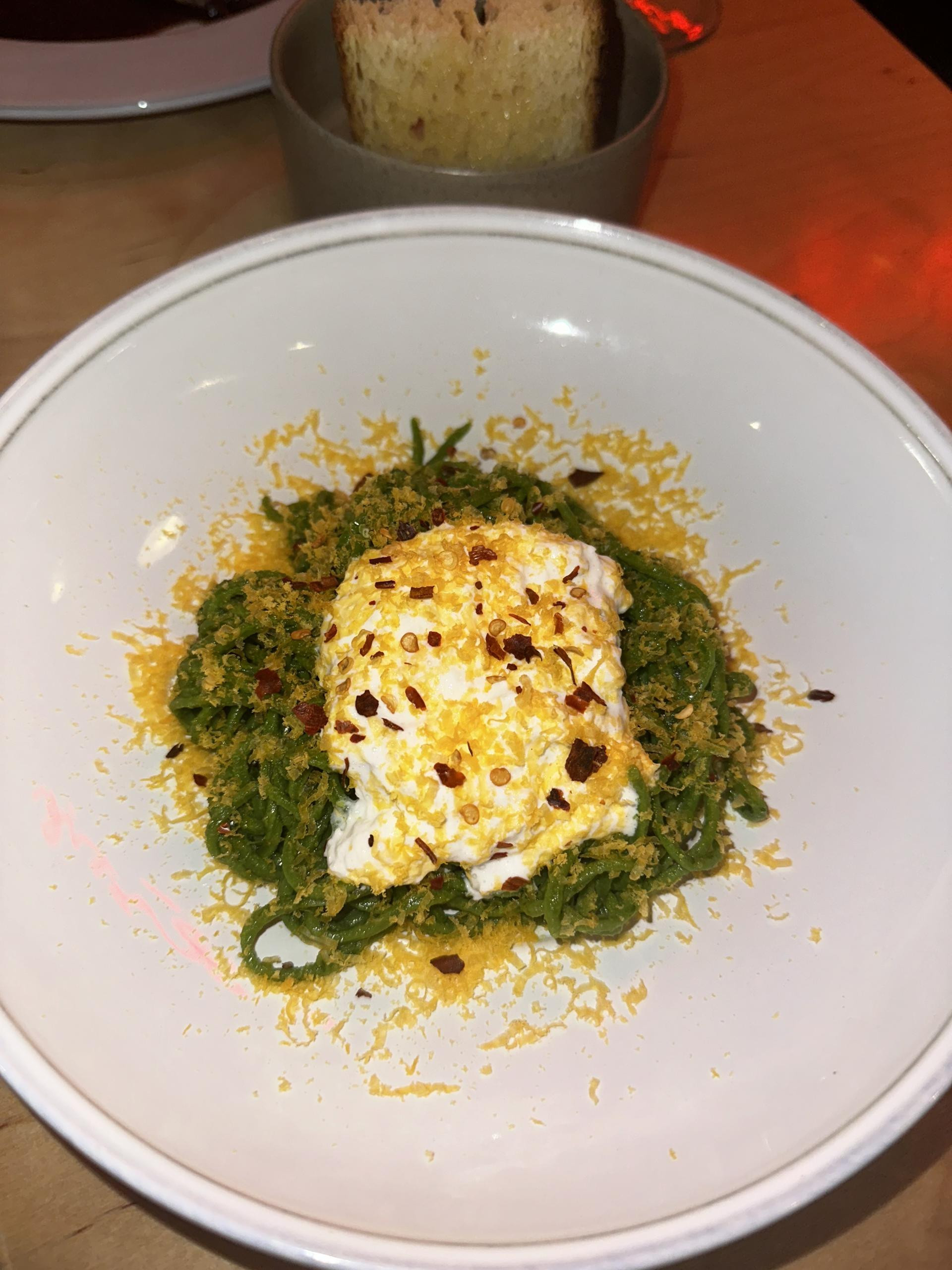 Tonnarelli od medvjeđeg luka sa straciatellom, usoljenim žumanjkom i limunom (24 €), jedno od glavnih jela, bili su tehnički precizno pripremljeni. Tonnarelli su vrsta duge tjestenine slične špagetima, ali deblje i kompaktnije teksture - idealne za upijanje umaka. Okus medvjeđeg luka bio je prisutan, ne napadan, a straciatella se lijepo stopila s limunom. Usoljeni žumanjak dodaje umami notu, no i ovo jelo kao da traži kontrast - hrskavost, kiselinu, neki neočekivani element koji bi nas zatekao.