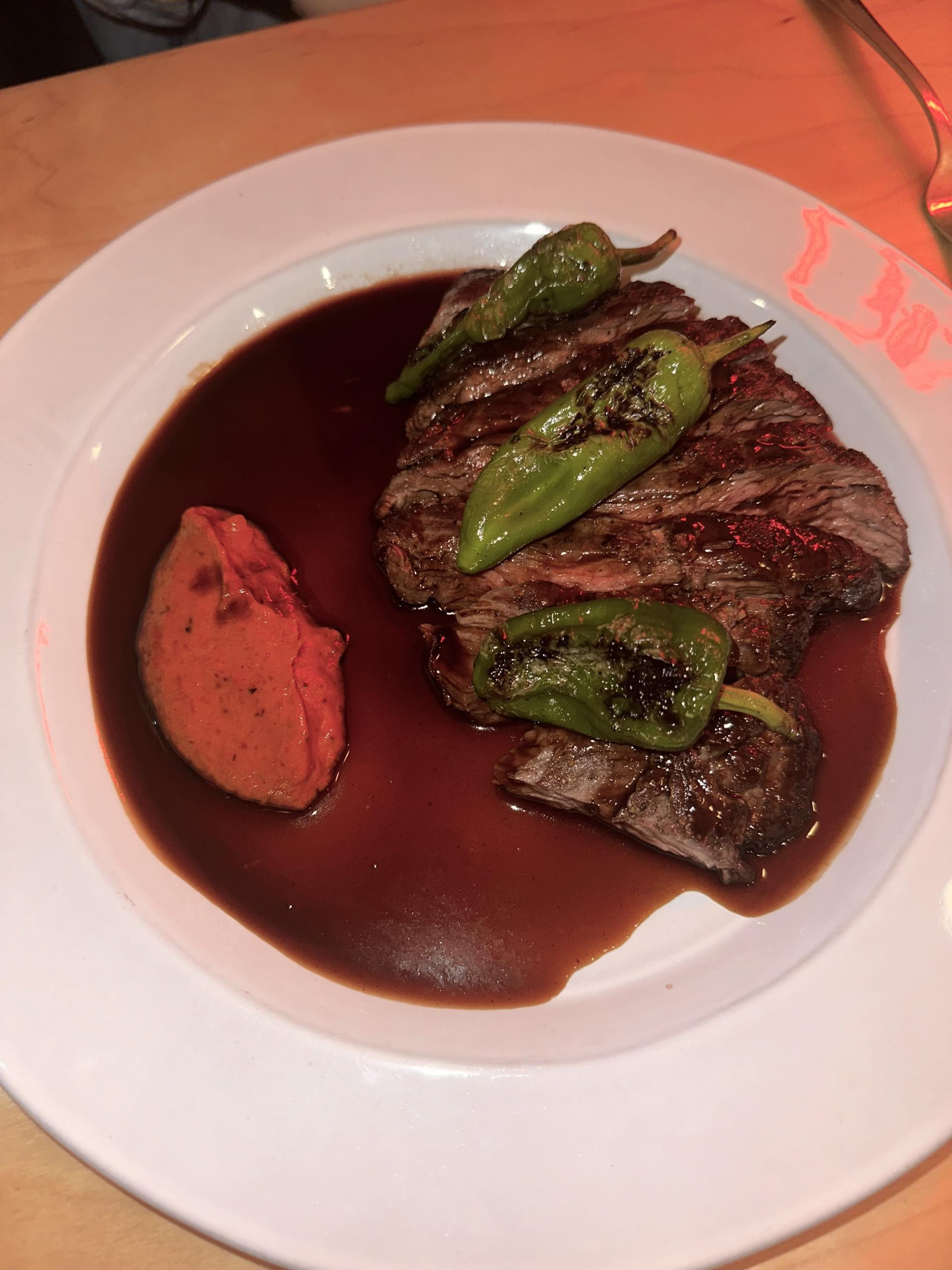 S druge strane, bavette s pireom od paprike, padron papričicama i jusom (30 €) ponudio je vrlo elegantnu kombinaciju. Bavette je rez mesa s potrbušine goveda, uz flank, odličan za kratku termičku obradu. Meso je bilo meko, sočno i savršeno pečeno. Pire od paprike, najdojmljiviji element tanjura, dao je slatkoću i dubinu. Jus bogat i uravnotežen. Iako nije bilo velikih iznenađenja, ovdje se sve složilo.