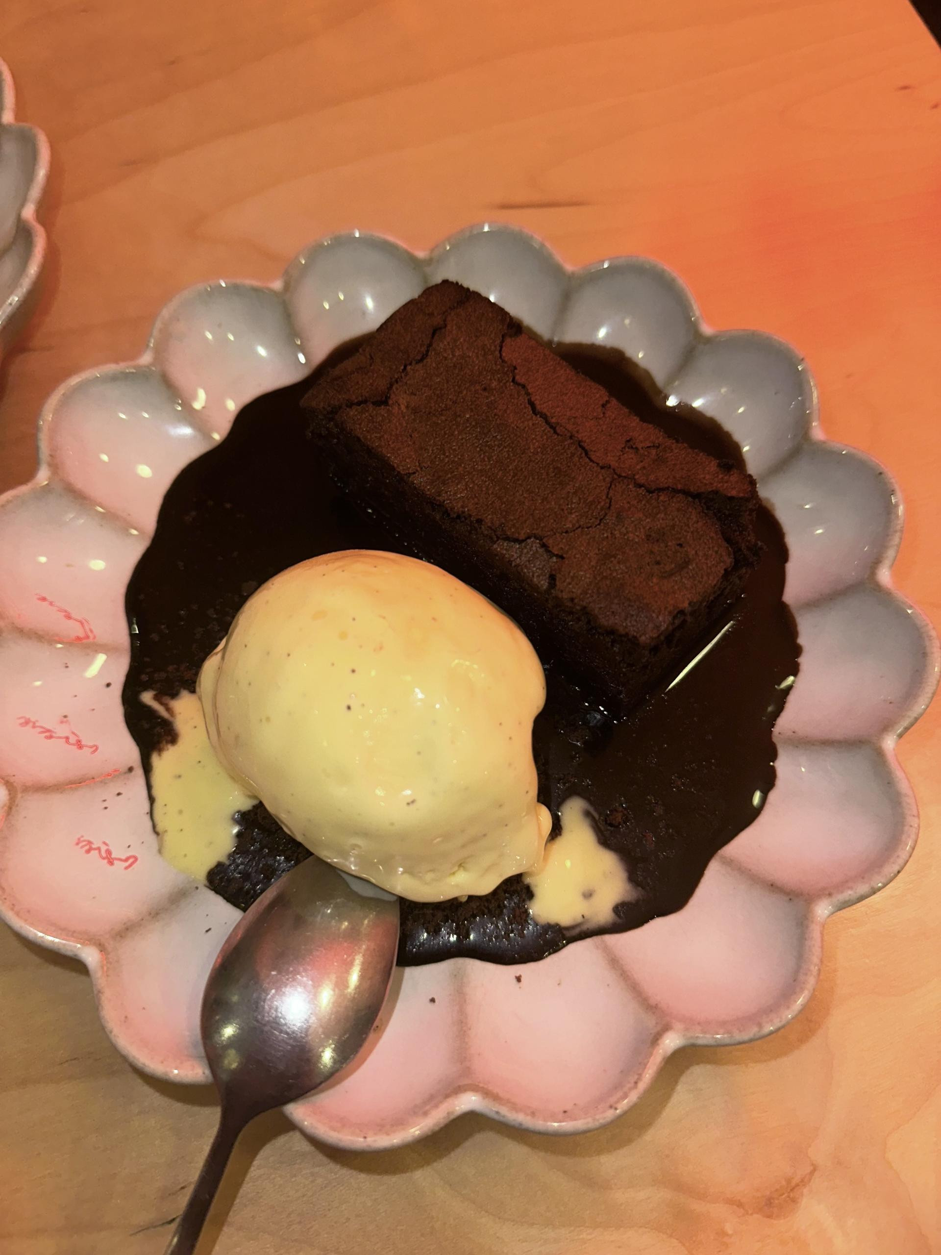 Brownie sa sladoledom od vanilije i glazurom od kakaa (7,50 €) je, pak, bio najklasičniji desert večeri. Vanjština brownija bila je nešto tvrđa no što bismo željeli, ali unutrašnjost meka, topla. Sladoled kremast, glazura čokoladna. Fino, ali predvidljivo - nije jelo za pamćenje, već za sigurnu završnicu.