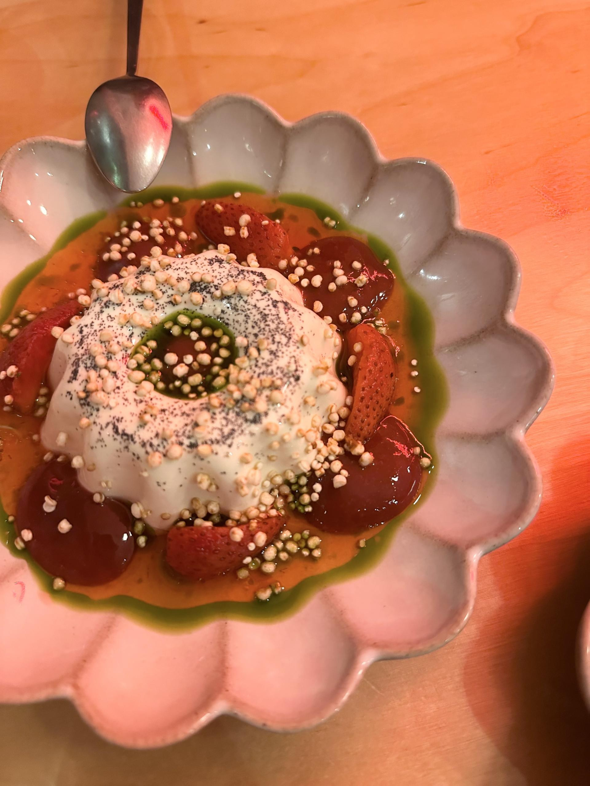 Panna cotta od mlaćenice i tonke s jagodama, matičnjakom i quinoa popsima (7,50 €) bila je desert koji nas je osvježio i razveselio. Mlaćenica daje kiselu svježinu, tonka laganu egzotiku, a quinoa popsi razigranost u teksturi. Desert koji uspješno kombinira više tehnika i tekstura, i baš zbog toga funkcionira.