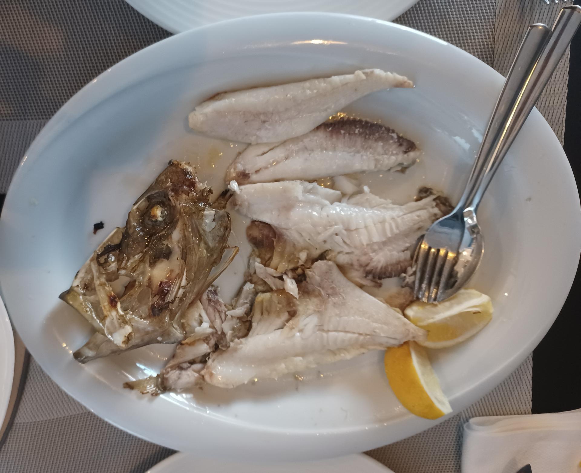 A onda smo se odlučili na najveći test: kovača s gradela (490 kn/kg). Imali su ih, kako su nam rekli, tri komada (uz nekoliko manjih orada i brancina od kilograma), a mi smo odlučili podijeliti onog srednjeg, od 80 dkg. Ponudili su nam ga i pečenog u pećnici s krumpirima, no htjeli smo provjeriti umješnost grilmajstora. Kovač ili šanpjer, naime, s obzirom na specifičnu građu tijela i kvalitetu mesa, iziskuje iznimnu vještinu "gradelavanja". Stigao je do našeg stola na kolicima na kojima ga je konobarica vješto isfiletirala i poslužila nam ga na pladnju, uz odvojenu glavu na kojoj su i dvije slasne obrazine. Ipak, bilo je to svojevrsno kockanje: ribu nam nisu donijeli pokazati svježu, prije nego što su je bacili na gradele. Uobičajena blitva kao prilog bila je dobro skuhana, svježa, živo zelena i gotovo hrskava, a ni krumpir, kojeg nije bilo previše, nije bio raskuhan. Sve skupa zaliveno finim maslinovim uljem iz proizvodnje Blata 1902, bilo je vrlo ukusno. Kriške limuna ipak bi trebali rezati neposredno prije serviranja, nije ih bilo lijepo vidjeti ovako sasušene. U ribi smo uživali, iako ju je trebalo možda malo kraće peći, jer je mjestimična zagorjelost kože na rubovima u pojedinim zalogajima dominirala nad okusom delikatnog kovačeva mesa.