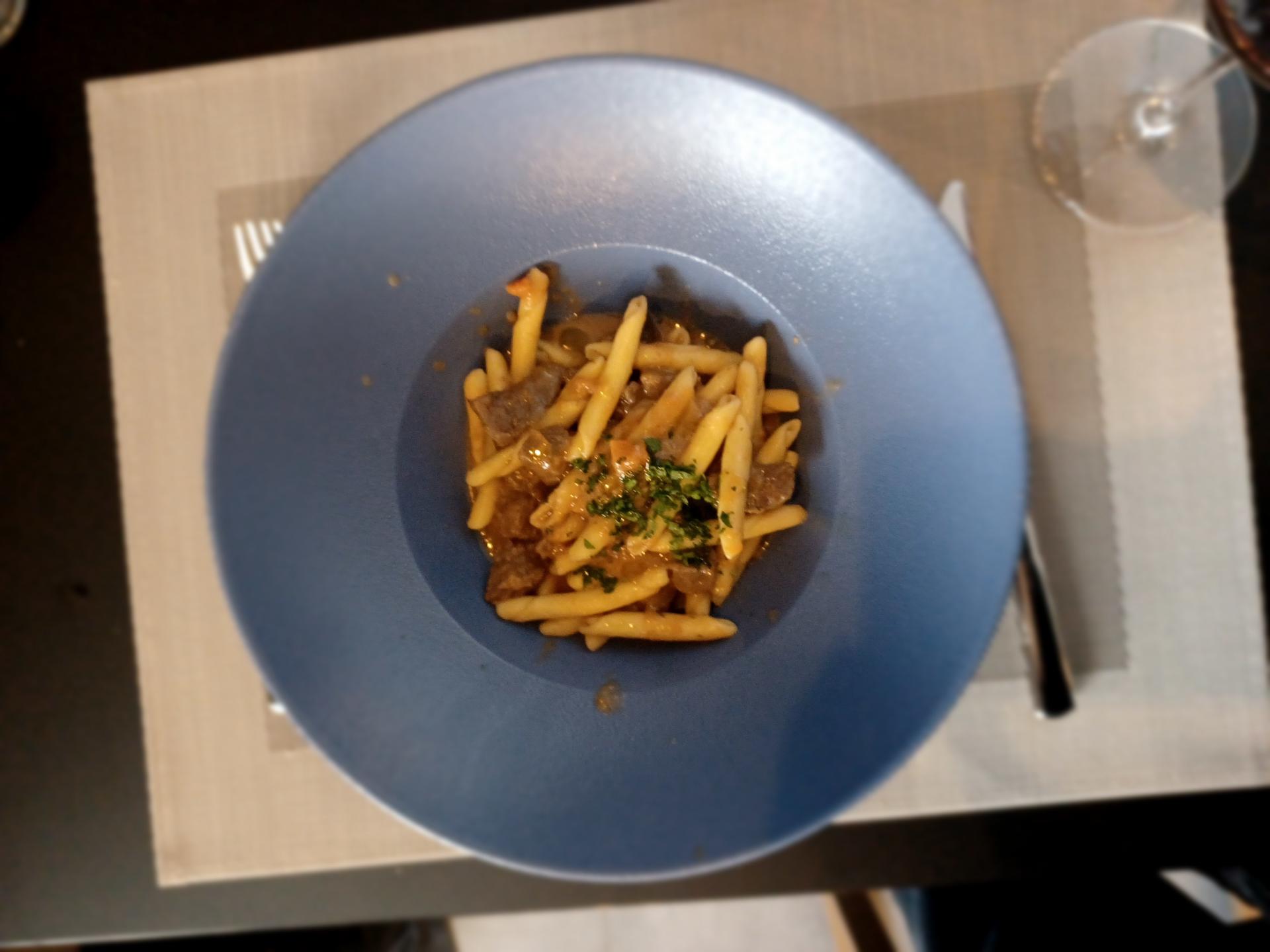 Uza sve to lijepo je pristajao vrhunski pošip Težak Blata 1902. Vinska lista inače nije velika, ali je vrlo dobra - među vinima iz vlastite vinarije, uz druge korčulanske i južnodalmatinske vinare, ovdje nude i nekoliko odabranih etiketa iz Bregovite Hrvatske, Slavonije i Istre. Budući da smo odlučili probati i jedno mesno jelo, žrnovske makarune u junećem umaku, naručili smo i čašu Kabolina odličnog Cabernet Sauvignona, vina koje rijetko vidimo na restoranskim vinskim listama. Žrnovski makaruni, malo grublja inačica istarskih fuži, u jednostavnom šugu od junetine, bili su skuhani al dente, no meso, rezano na kockice, ipak je ostalo pretvrdo. Ovo rustikalno jelo zaslužuje malo više posvećenosti detaljima.