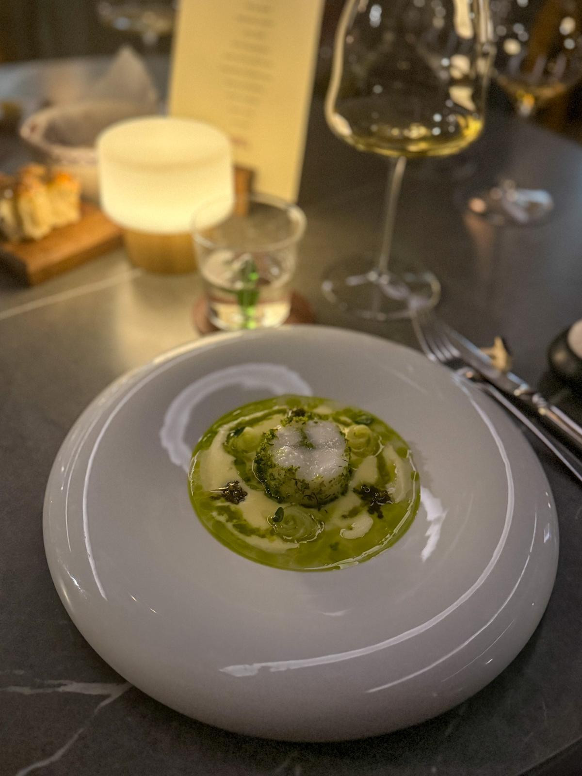Prvi slijed, cappuccino od poriluka sa škampom sotiranim na maslacu, graškom i pikantnom pjenicom. Lagane i pjenaste teksture, čistih okusa, s naglašenim, dobro kontroliranim intenzitetom. Solidan početak, lepršav i dovoljno zategnut da probudi apetit. Sparivanje s Maximin Grünhaus Schloss Kabinettom 2023 donijelo je blagu voćnu slatkoću i izraženiju kiselinu koja precizno reže pikantnost i maslačnu komponentu škampa.