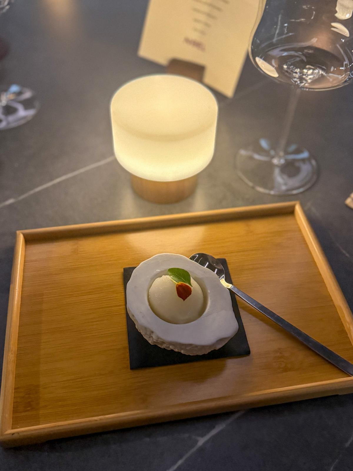 Petit four stiže kao tri mala zalogaja: pralina od cvjetače s bijelom čokoladom i medom, klasična madlenica i pâte à choux s kurdom od naranče. Sva tri su slasna, premda ne odviše maštovita. Uz njih je ponuđen širok izbor dižestiva, a odabrali smo Hakutsuru Umeshu Genshu, lagani japanski liker od šljive.