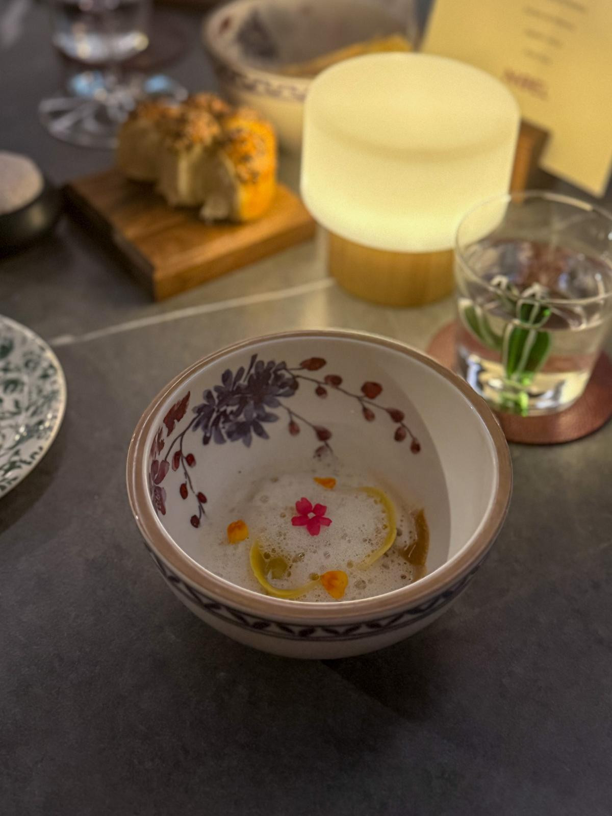 Kratak predah, međuslijed. Mliječno pecivo glazirano medom, selekcija domaćeg kruha i maslac s limunovom koricom. Pecivo izvrsno, na slađu stranu, mekano i toplo, s čistim mirisom maslaca, a selekcija kruha predvidljiva i odstajala. Maslac je vrlo dobar, limunova korica lijepo se veže uz mliječno pecivo i čisti nepce prije nastavka.