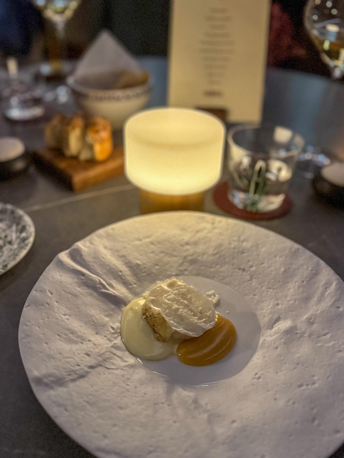 Drugi slijed, autorska štrukla Noela punjena svježim kravljim sirom, uz karamelizirano vrhnje i mliječni crumble. Jelo je jako dobro; poznatih okusa, ali s neočekivanom slatkoćom vrhnja koja lijepo kontrira svježini sira. Uparivanje s istarskom Malvazijom OMO 2023 pojačava taj efekt, vino nosi punije tijelo i viši alkohol koji drži strukturu, uz dovoljno kiselina da zategne slatkaste note Noelovih štrukli.