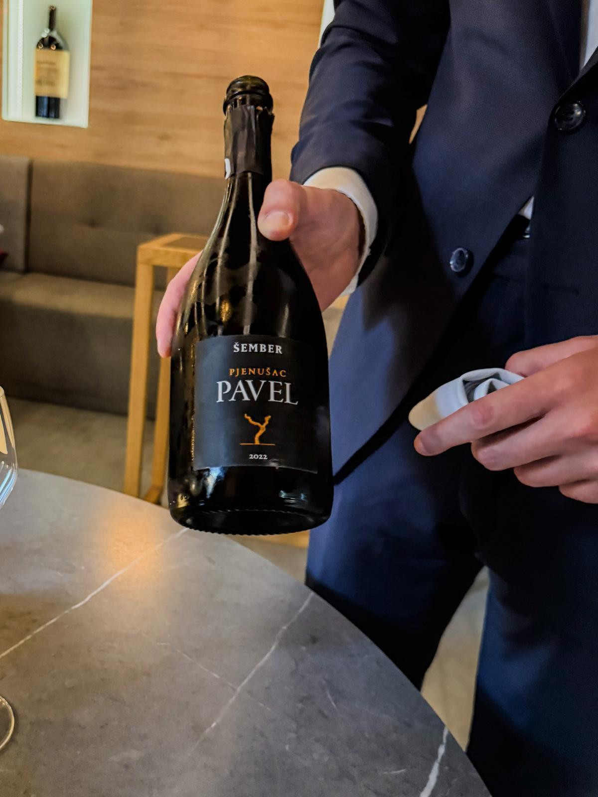 U vrijeme dolaska prostor je bio miran, uz jednu veću grupu, atmosfera opuštena i ležerna. Filip, naš glavni konobar večeri, ponudio nas je pjenušcem kojeg nismo mogli odbiti: Šember Pavel (12 €), ponajbolje pjenušavo vino Plešivice, otvorio je večeru elegancijom, dugim perlanjem i kremoznošću.