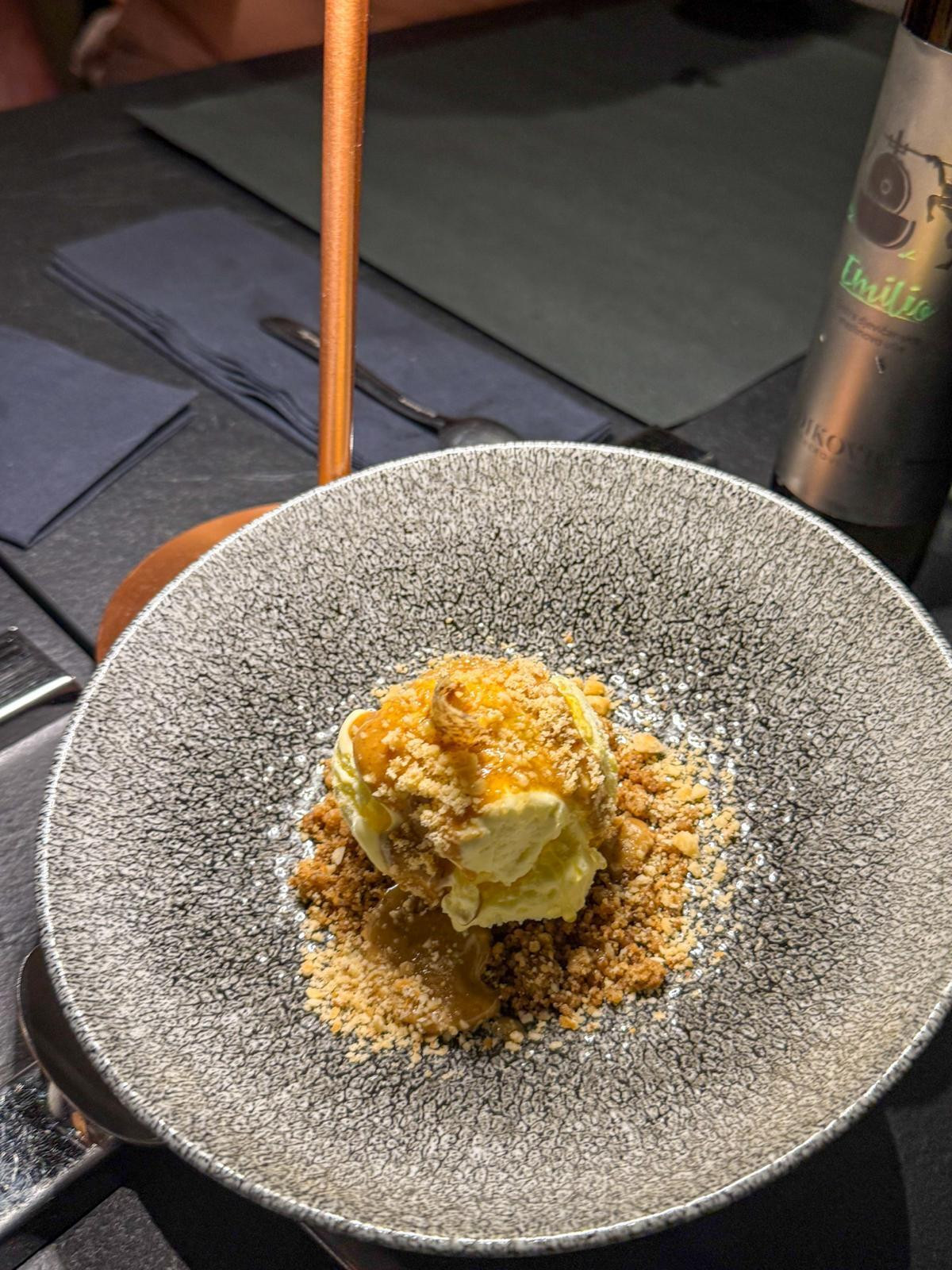 Veliko finale, deserti. U ponudi su bila dvije opcije, a budući da smo bili neodlučni, naručili smo oba. Prvi, semifreddo s čokoladom i kakao crumbleom, bio je vrlo fin, no pravi heroj priče bila je menta koja je razbila monotoniju i zaokružila okuse. Drugi desert, domaći sladoled od vanilije s karamelom i crumbleom od lješnjaka, bio je jako dobar, a konobarica je pred nama posula i par kapi ulja od lješnjaka, što je dodatno podiglo jelo.