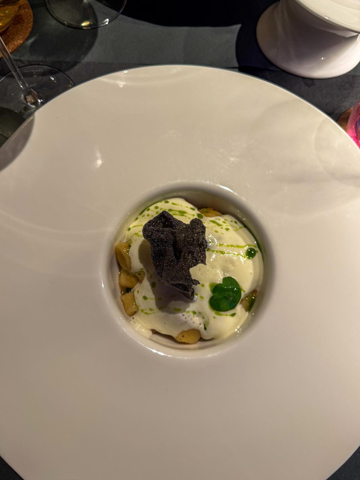 Sljedeći slijed potvrdio je glasine koje smo načuli od susjednog stola, na redu je bio hit restorana. Domaći njoki s bogatim raguom od sipe, upotpunjeni uljem bosiljka, hrskavim čipsom od crne riže i prozračnom pjenicom od parmezana, pokazali su se kao vrlo usklađeno jelo. Njoki su bili odlični, a pjenica ugodno slana. Vinska pratnja bila je jednako uzbudljivo otkriće. Kušali smo odležanu malvaziju Curiticum Amber 2022. iz vinarije La Vie. Riječ je o elegantnom oranžu, maceriranom vinu začudno lakšeg tijela i dugog završetka, koje se pokazalo kao dobar par njokima.