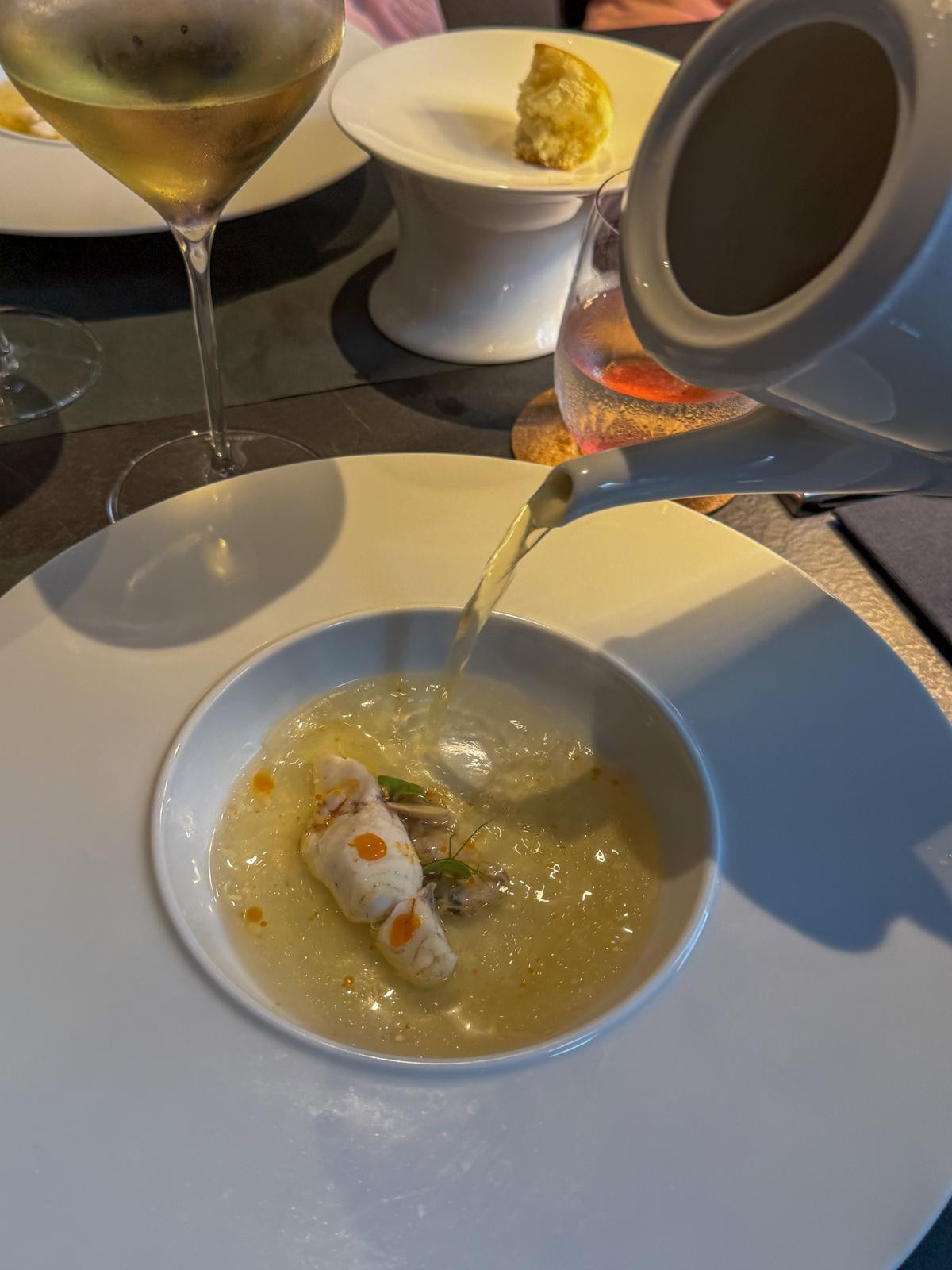 No, prava večera tek je započela. Konobar nam za stol donosi tanjur u kojemu se nalazi kuhani filet trlje i nekoliko dagnji, preko kojeg prelijeva riblji temeljac, odnosno juhu. Krasna igra okusa, u kojoj ulje od trlje igra ključnu ulogu. Vrlo lagana, prozračna, ali karakterno bogata juha. Uz juhu nam je poslužen Dekan, graševina iločke vinarije Trs.