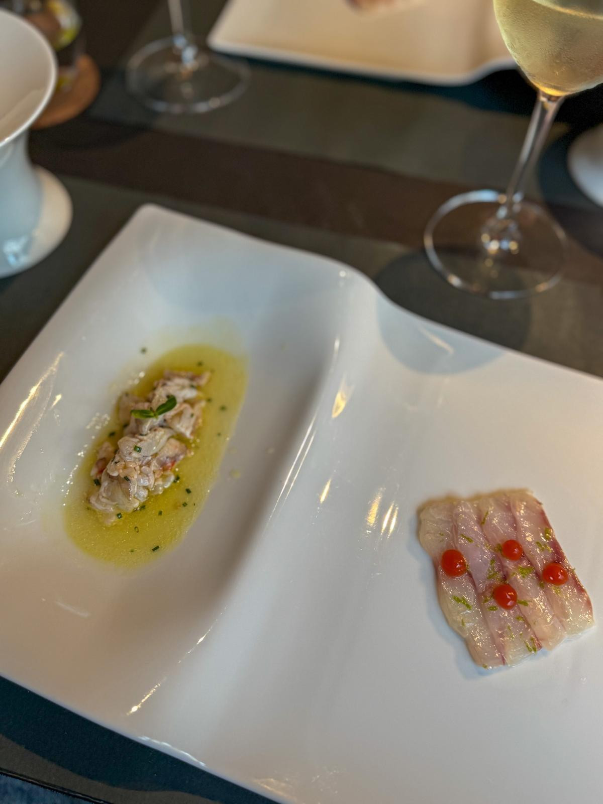 Prvi slijed sastojao se od dva zalogaja. Krasan, nježan carpaccio od brancina s gelom od slatke rajčice za svaku je pohvalu, dok je tartar od kozica ponovno nadvladao pretjerani sok limuna. Uz jela smo dobili i zanimljivu domaću pogačicu, koja je balansirala između slatkoće i slanoće. Uz prvi nam je slijed poslužen svjež Prekratić Cuvee Blanc 2024.