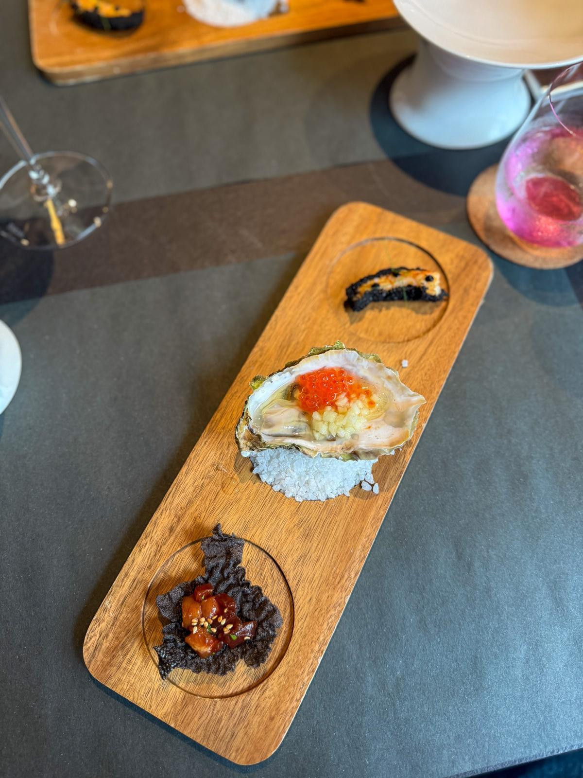 Pozdrav iz kuhinje stigao je serviran na drvenoj dasci, predstavljen kao trio minijaturnih zalogaja. Prvi je bio vrlo uspješan - pržena i marinirana lokarda na hrskavom papiru od crne riže. Središnji dio, kamenica s gelom od limuna, ikrom i češnjakom, bio je nažalost manje uspješan. Intenzivni okusi limuna i češnjaka potpuno su nadjačali delikatan morski karakter školjke. Srećom, završetak je popravio dojam, pečeni škamp u crnom sezamu bio je sočan i ugodno hrskav. Pomalo neobičan i neujednačen uvod, koji je jasno pokazao kreativnost, ali i prostor za finija dotjerivanja u balansu okusa.