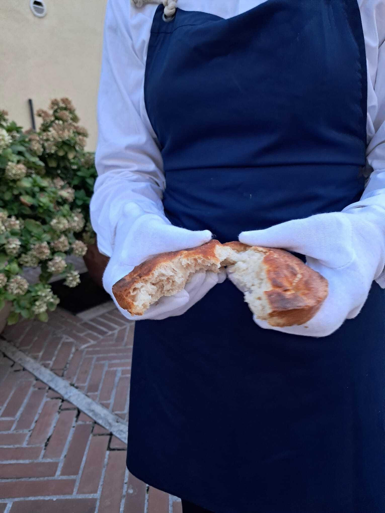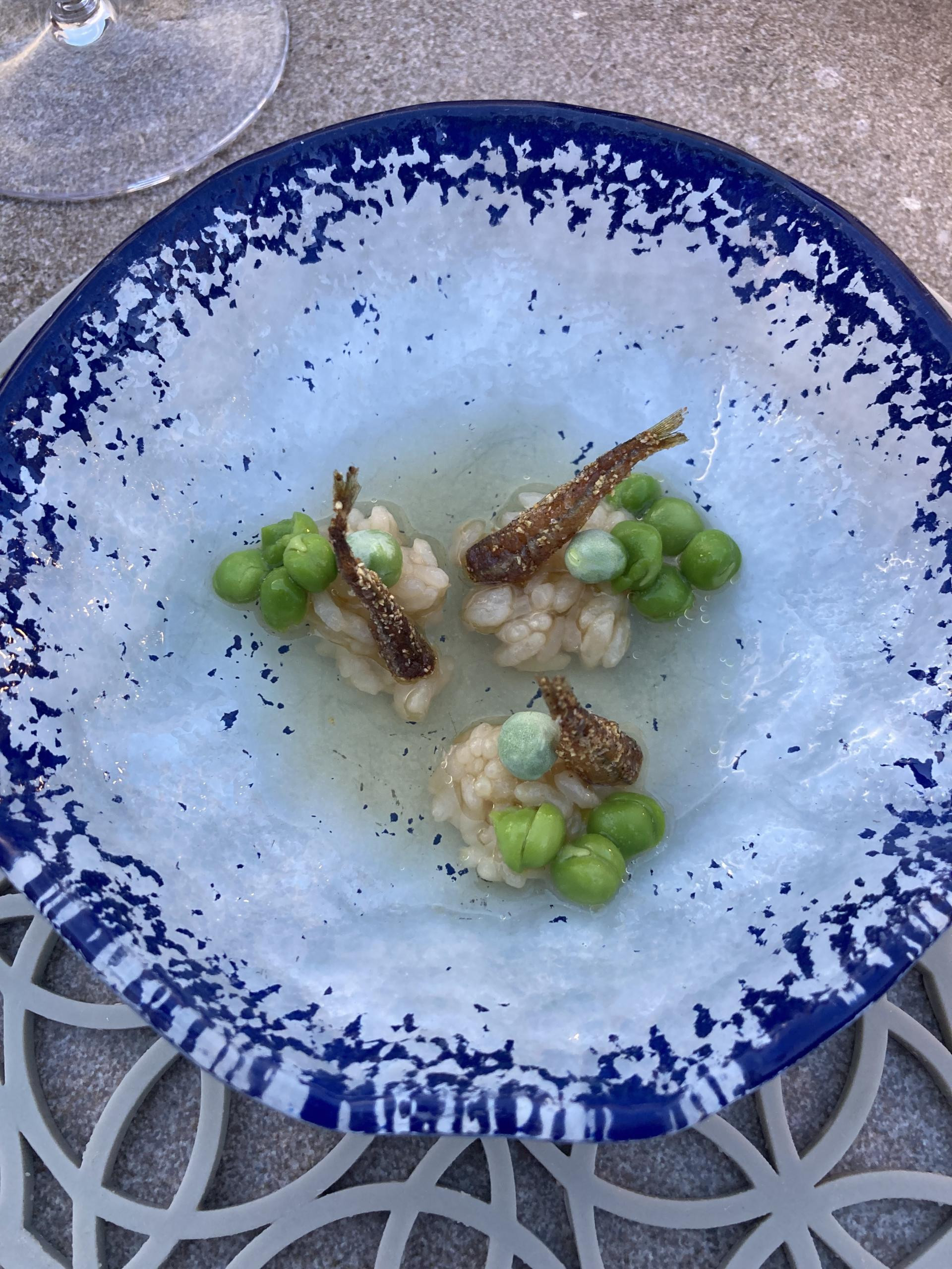 Ubrzo nam za stol stiže ljetna riblja juha: na tanjuru su tri hrpice rizibizija sa po jednom čokalicom u sredini, sitnom prženom ribom sličnom gavunima iz Prukljanskog jezera, koji nam konobarica za stolom prelijeva juhom od algi. Odmah potom rukama lomi kruščić pečen pod pekom - još jedan tradicijski čin - i stavlja ga na stol uz domaće maslinovo ulje. Kruh je starinski, puna, bogata okusa, a ulje vrhunsko dalmatinsko, vrlo blage gorčine i pikantnosti. Juha je osvježavajuća, nježno kiselkasta, gotovo azijskog karaktera, a čokalice slatke i savršeno hrskave. Jako fina kombinacija okusa.