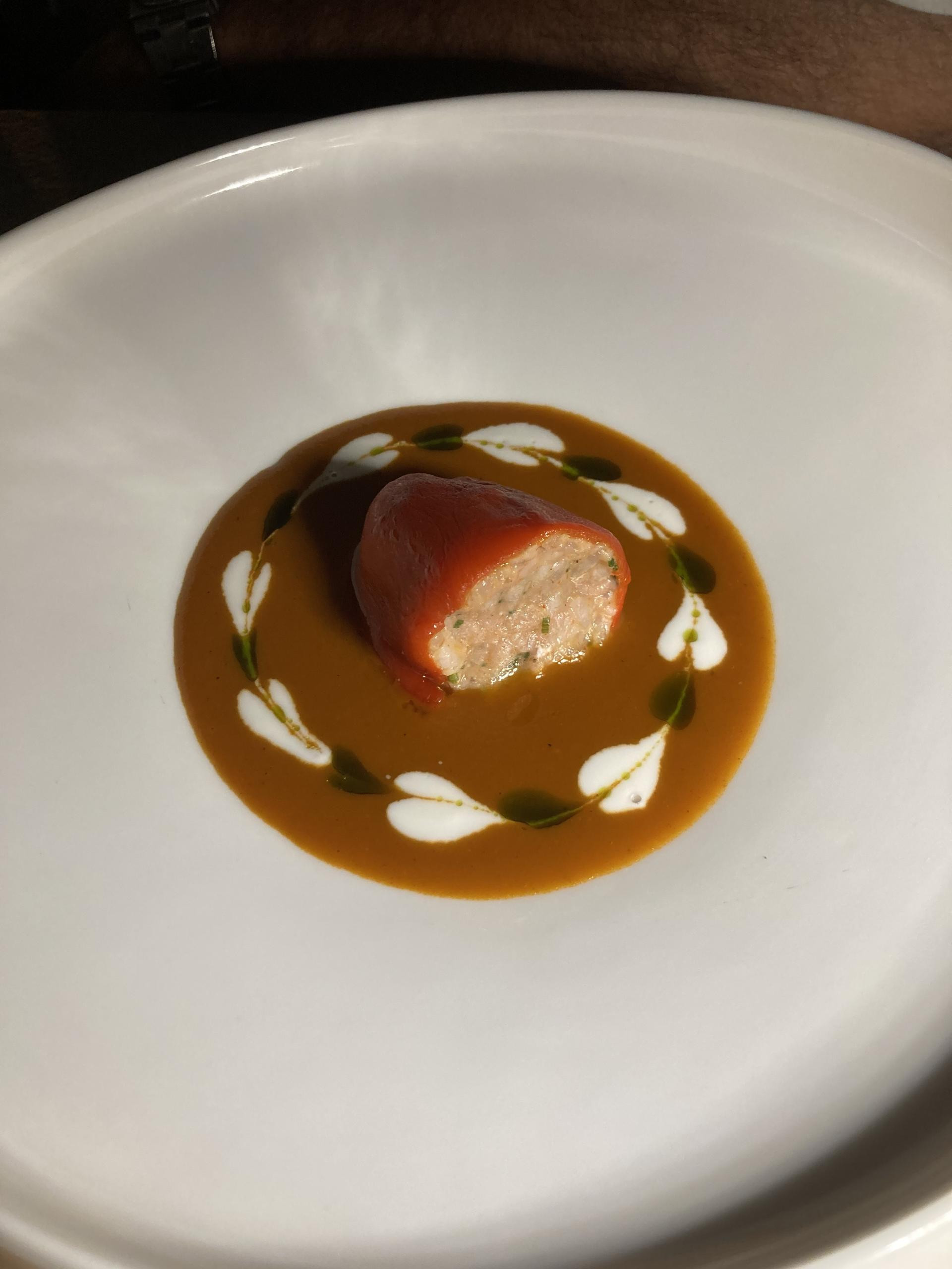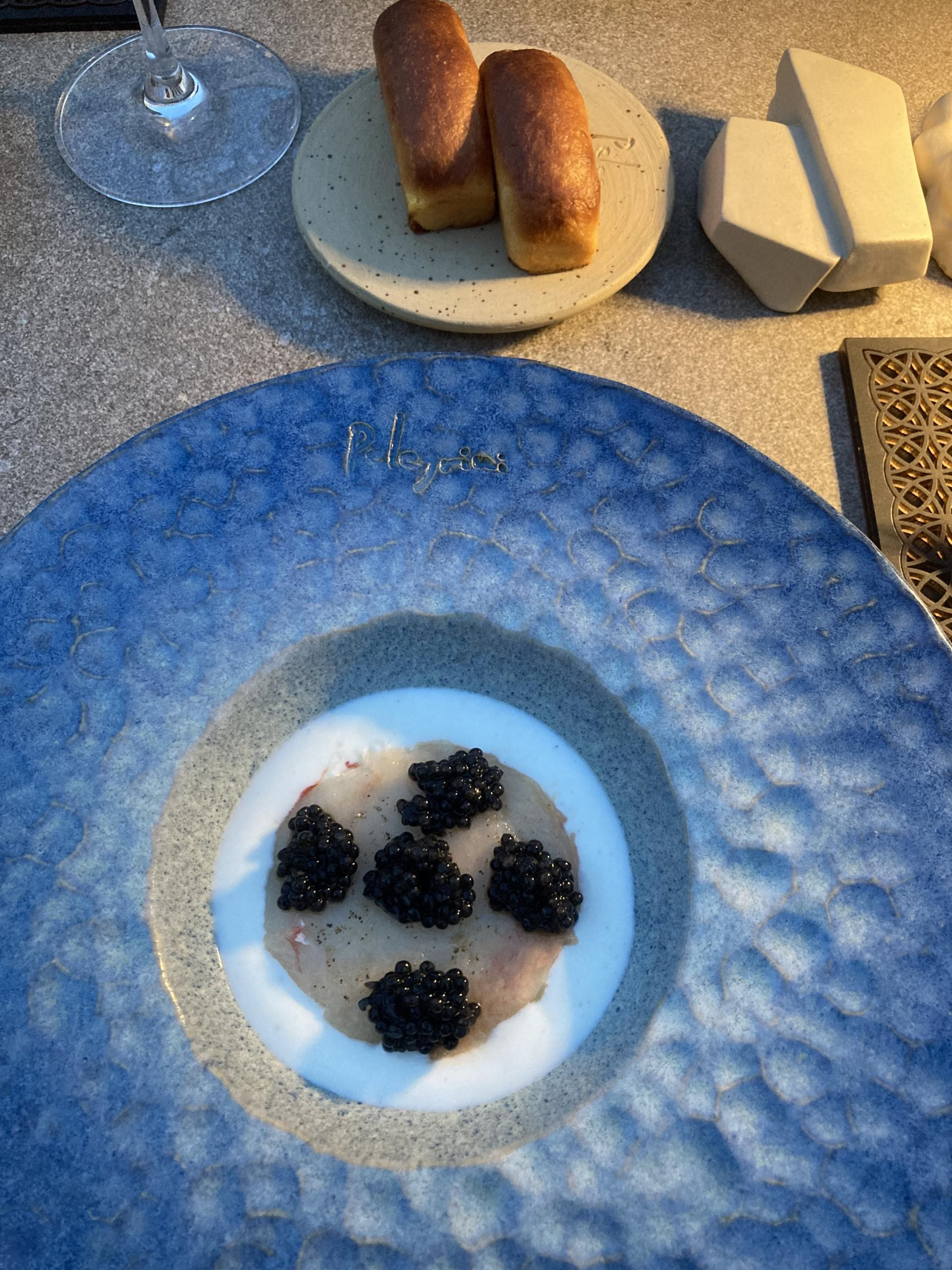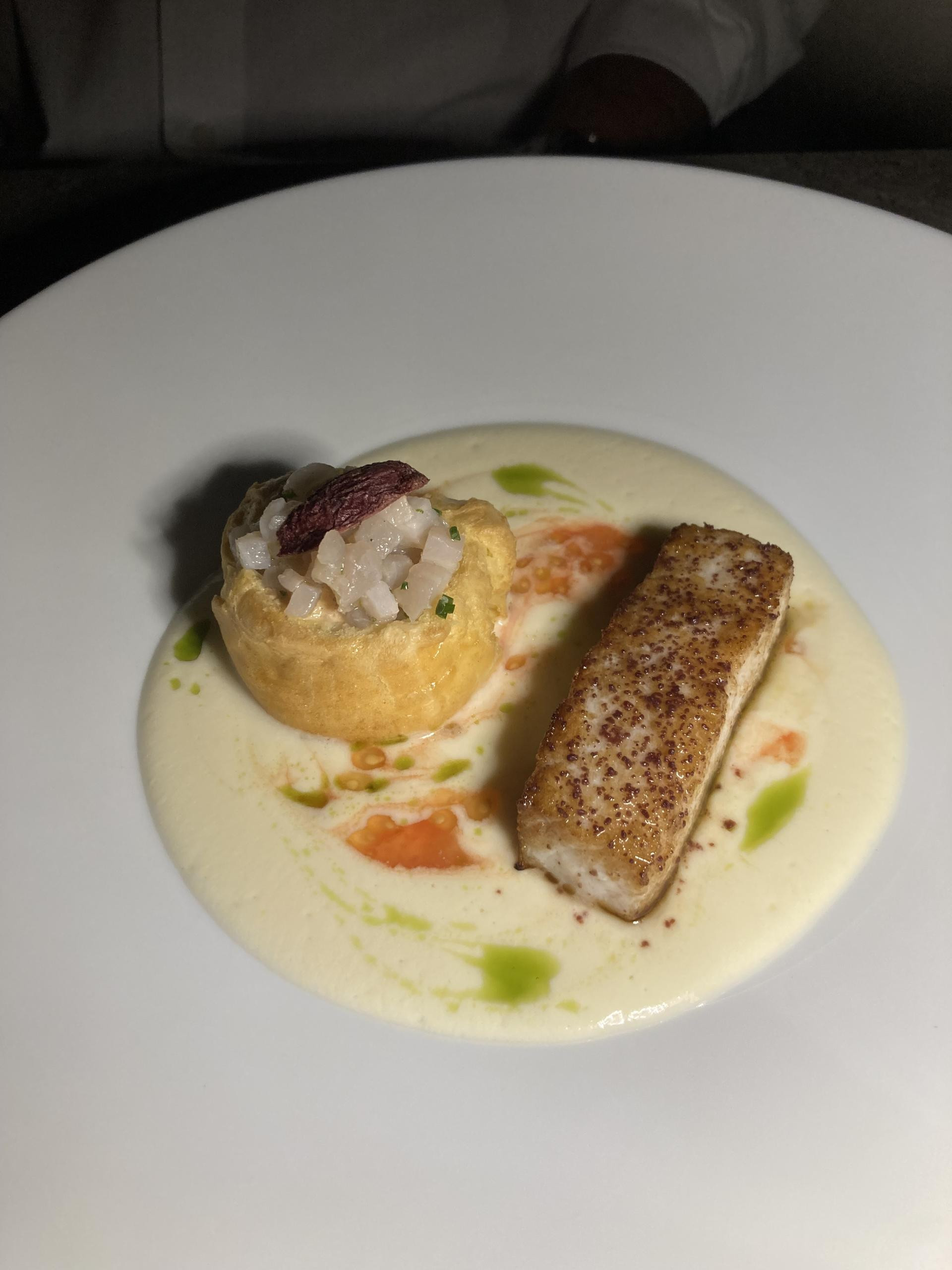 Večera i službeno počinje. Prvi slijed: tartar od škampa položen u kefir s uljem smokve, prilično obilno pokriven kavijarom, topao domaći brioš. Odlično jelo koje izvrsnim balansom ruši predrasudu o kombinaciji mliječne i morske namirnice. Škamp je prezentiran u formi diska, nije previše ohlađen jer je sasvim svjež, a domaći je kefir duboka okusa, gotovo poput sira.