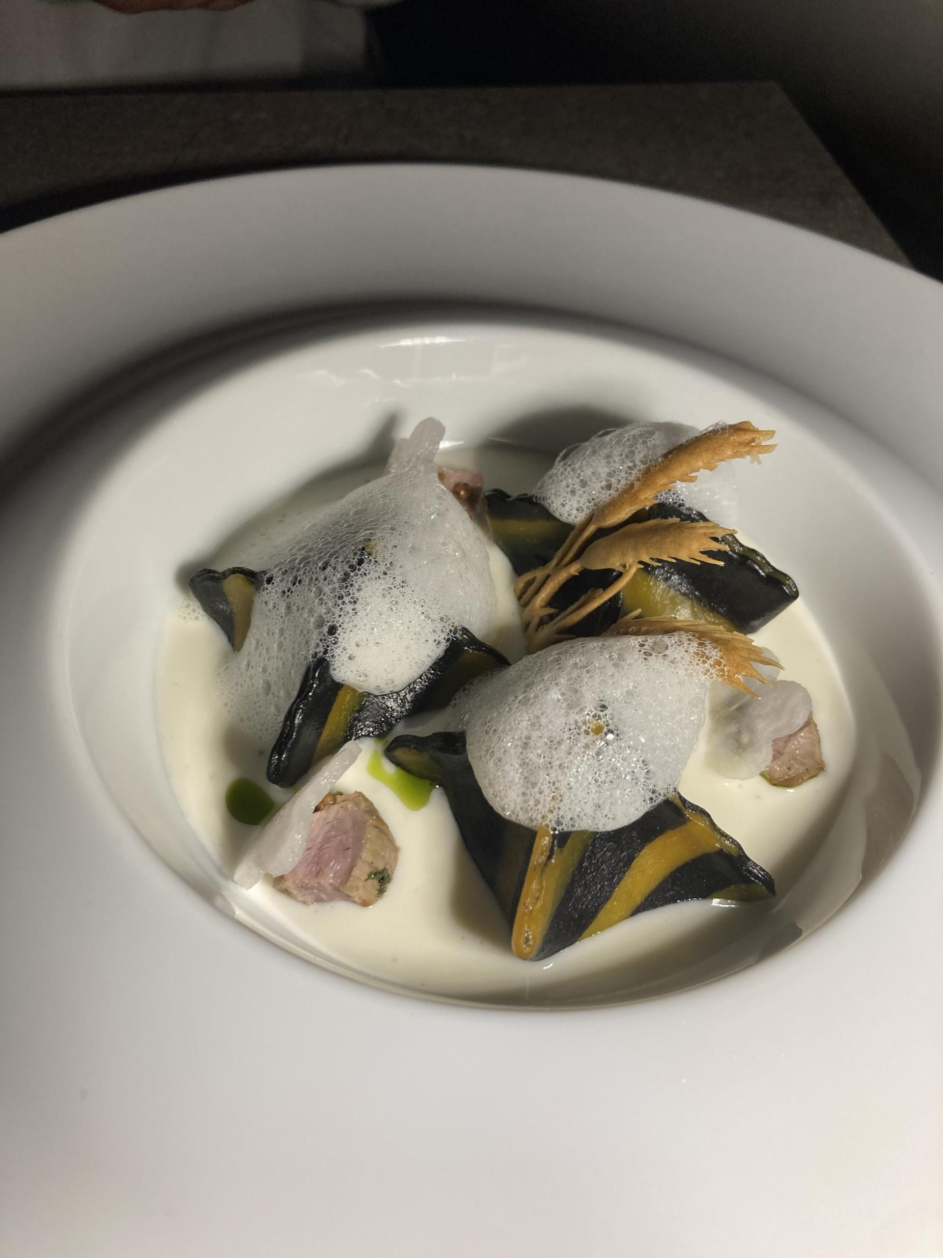 Stiže treći slijed: domaći ravioli punjeni janjetinom, na kremi od sira. Bijeli cvjetić u kompoziciji izrezbaren je od repe, a sve je okupano u pjeni od majčine dušice. Okusno vrlo skladno, jedino je janjetina ipak malo pala u drugi plan - ovaj put "pojela" ju je tjestenina koja je ostala samo mrvicu pretvrda.