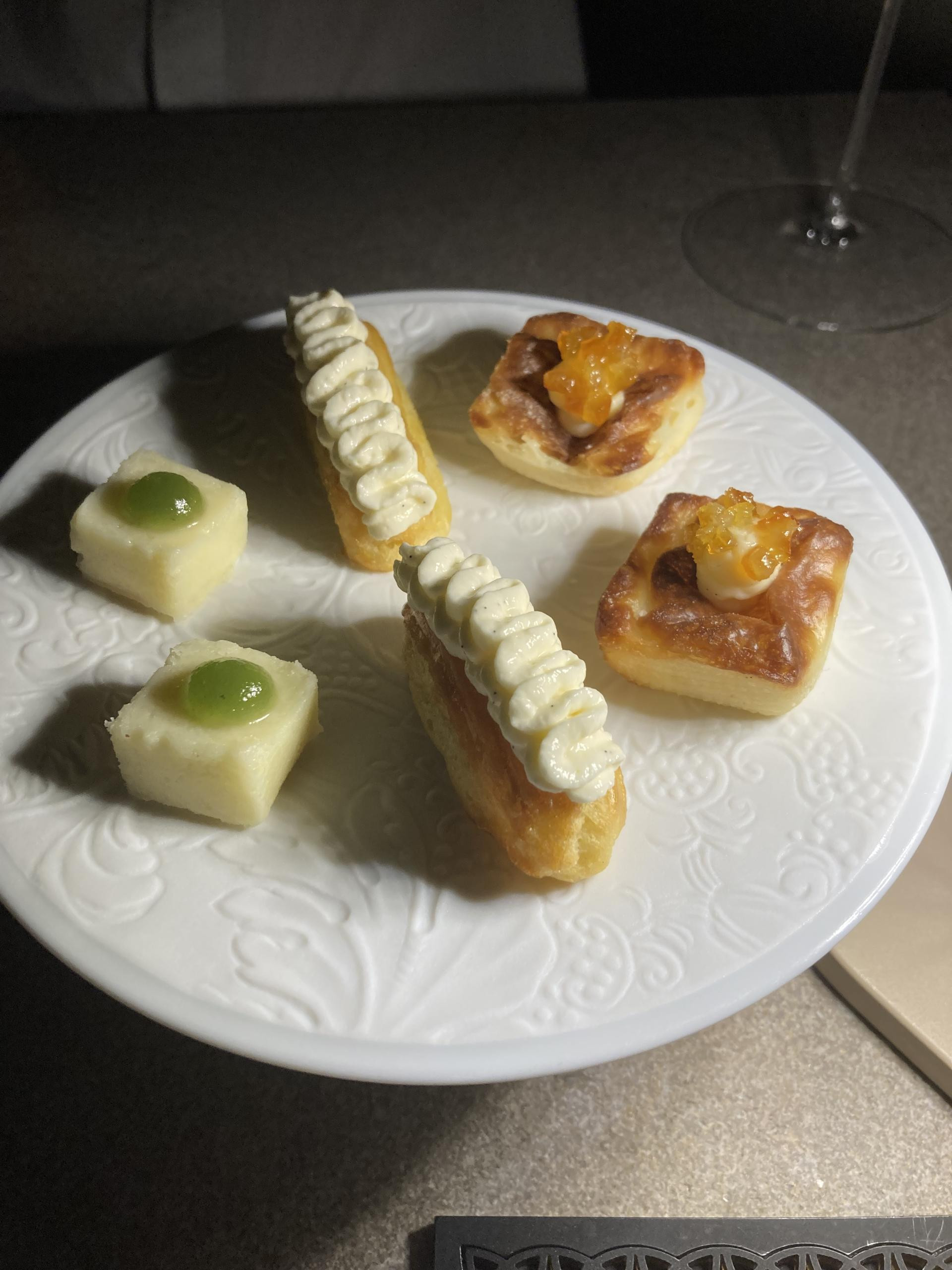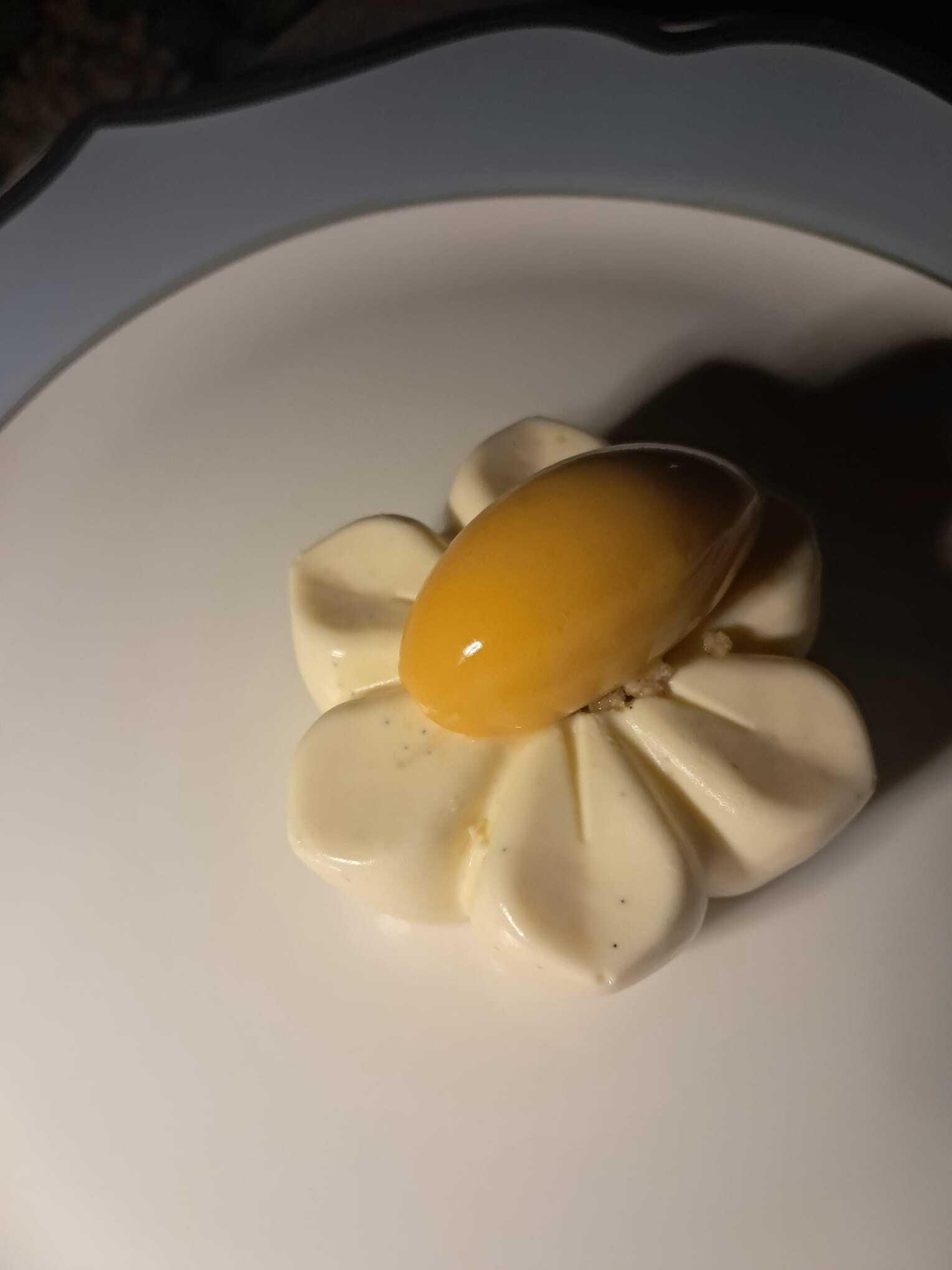 Preddesert - panna cotta, vanilija, mousse s maslinovim uljem i sorbet od šumskog voća - osvježenje je pred glavni desert koji je ujedno i konačni slijed, opet mliječni: fantastičan škorup cvjetnog oblika s bajamom, liofiliziranom murvom i marelicom. Naizgled jednostavan - poput cheesecakea, ali kompleksniji - ovaj vrhunski desert još je jedan duboki naklon tradiciji šibenskoga kraja. Prati je, za kraj, a i uz petit fours, Prošek kaštelanskog vinara Ivana Kovača Matele, od malvasije dubrovačke, koji i sam nosi arome marelica - slatko, ali ne i preslatko, s gorkastim završetkom.