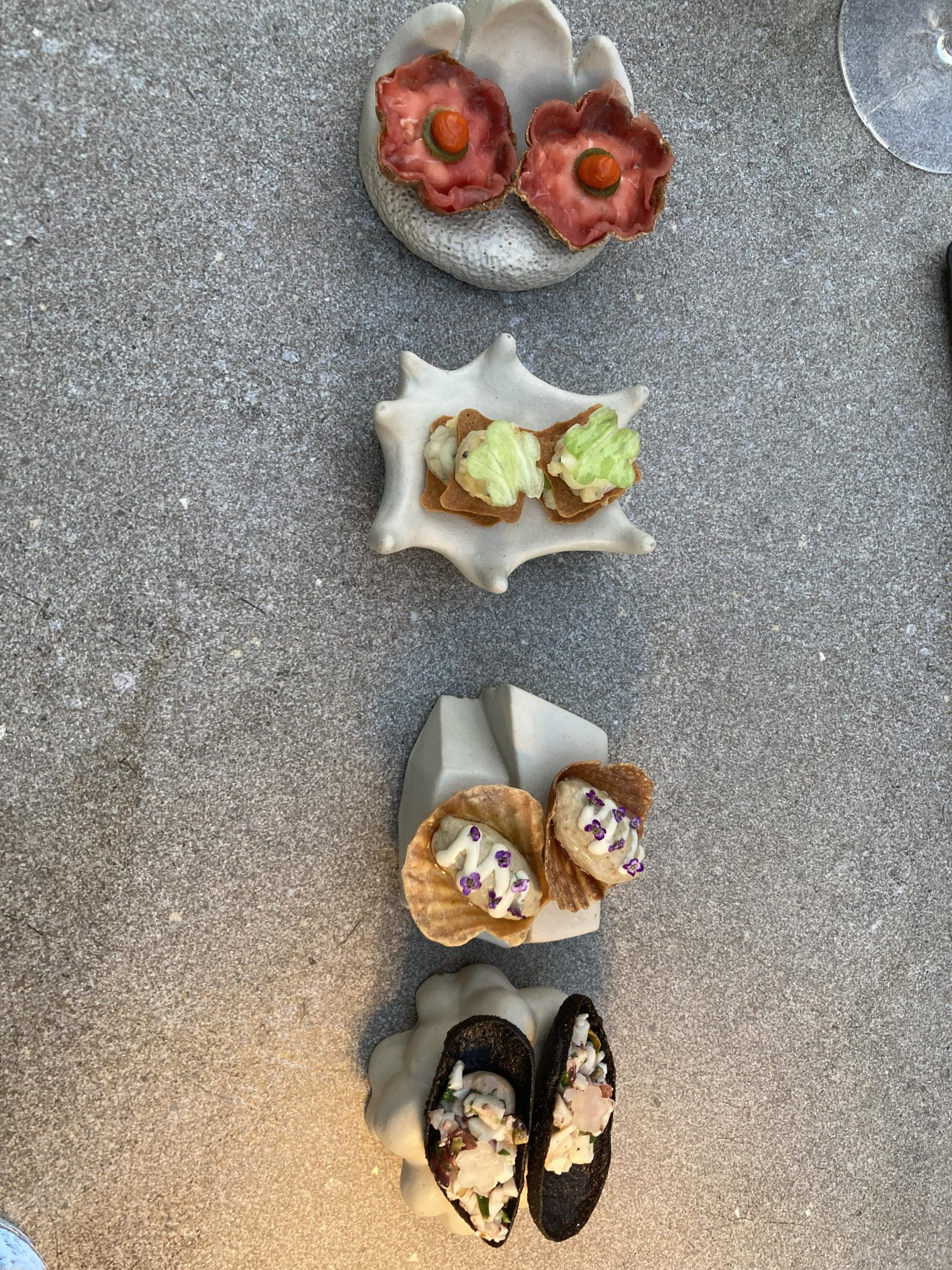 Terasa, koja prima 40 - 50 gostiju, polako se puni, većina gostiju su stranci, a za stol stižu prvi pozdravi iz kuhinje. Točnije, četiri mala zalogaja: salata od hobotnice u crnom čipsu, odljevu ljušture dagnje, do nje još jedna "školjka", mala kapica punjena pačjim mesom. Oba su prva dva pozdrava slasna, ali i masna, što svojim mineralnim karakterom osvježava treći: golci (riblja mlađ iz bočate vode Prukljana) s krumpir-salatom, odnosno njihova esencija između dva čipsa. Četvrti je zalogajčić najmoćniji: juneći carpaccio u kremi od paprike. Sve u svemu, mala demonstracija tradicionalnih lokalnih okusa.