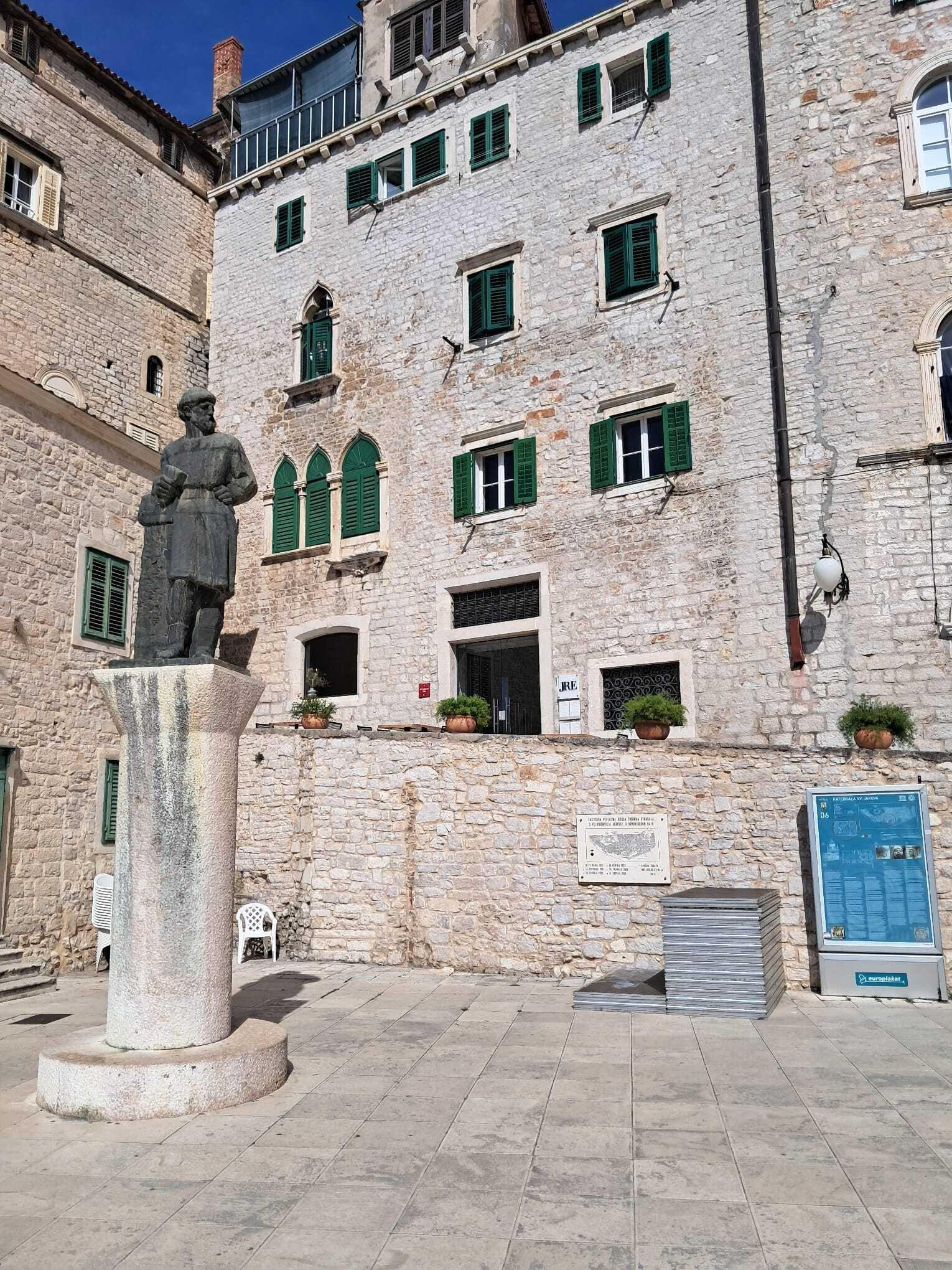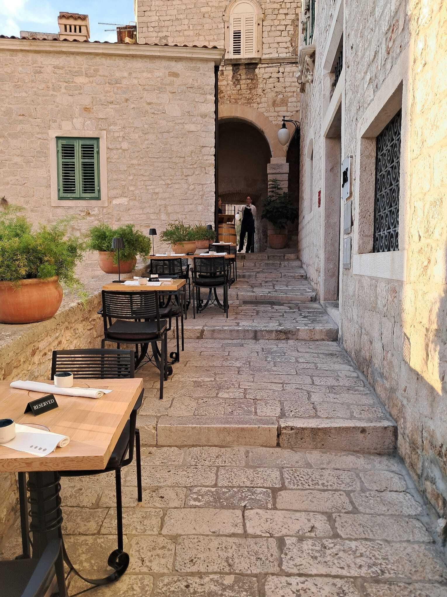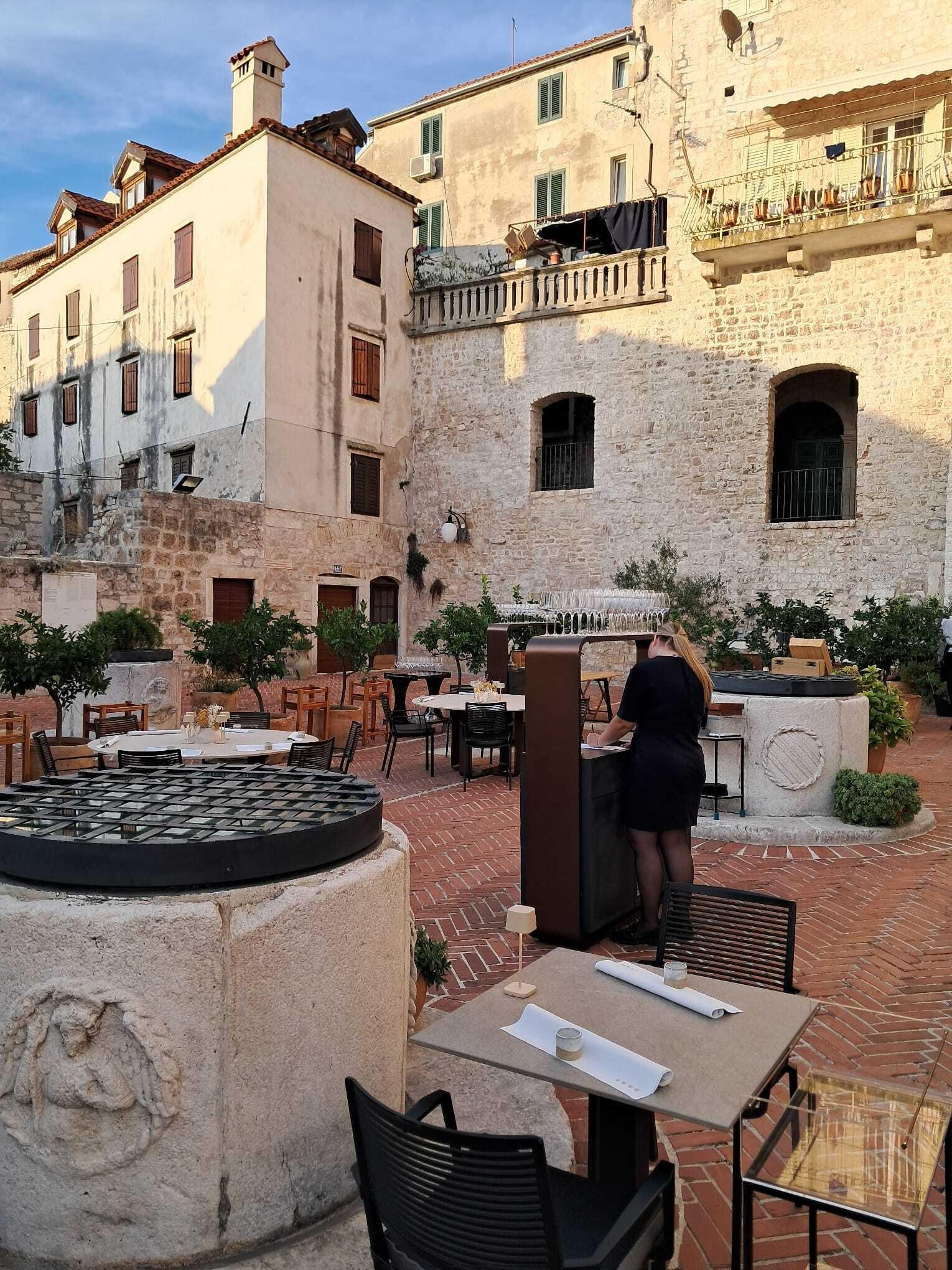 Na terasu restorana Pelegrini, u samom središtu starog Šibenika, stigli smo među prvima, oko pola sedam kada ovdje i kreću s večerom. Kao što je poznato, riječ je o jednoj od najljepših naših restoranskih terasa uopće. Sama palača obitelji Pellegrini, poznata još i kao Tambača, u kojoj je restoran smješten, elegantno je kameno zdanje samo 20-ak metara udaljeno od centralne šibenske atrakcije, slavne katedrale sv. Jakova.