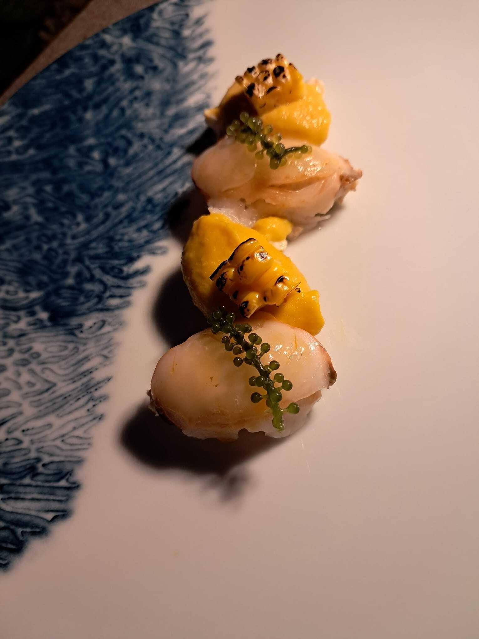 Chef Rudolf Štefan pozdravlja nas za stolom, a Branimir Vukšić donosi nove čaše u koje toči Sivi pinot 2024 nastao u suradnji s vinarijom Clai, koja traje već godinama, pa je nastavljena i pod novim vlasnicima vinarije. Vrlo živo, još nemirno, gotovo divlje vino na samom početku života. Preporuka je da otpijemo gutljaj dok nam je kruh još u ustima, a nakon zalogaja novog slijeda: pečenog jastoga s kukuruzom, koji dolazi u tri forme - u kremi, pečen i kao hrskava salatica, serviran s morskim grozjem, algom koja doista izgleda kao minijaturni grozd. Fino jelo u kojem kukuruz nije sasvim prekrio blag okus jastoga.