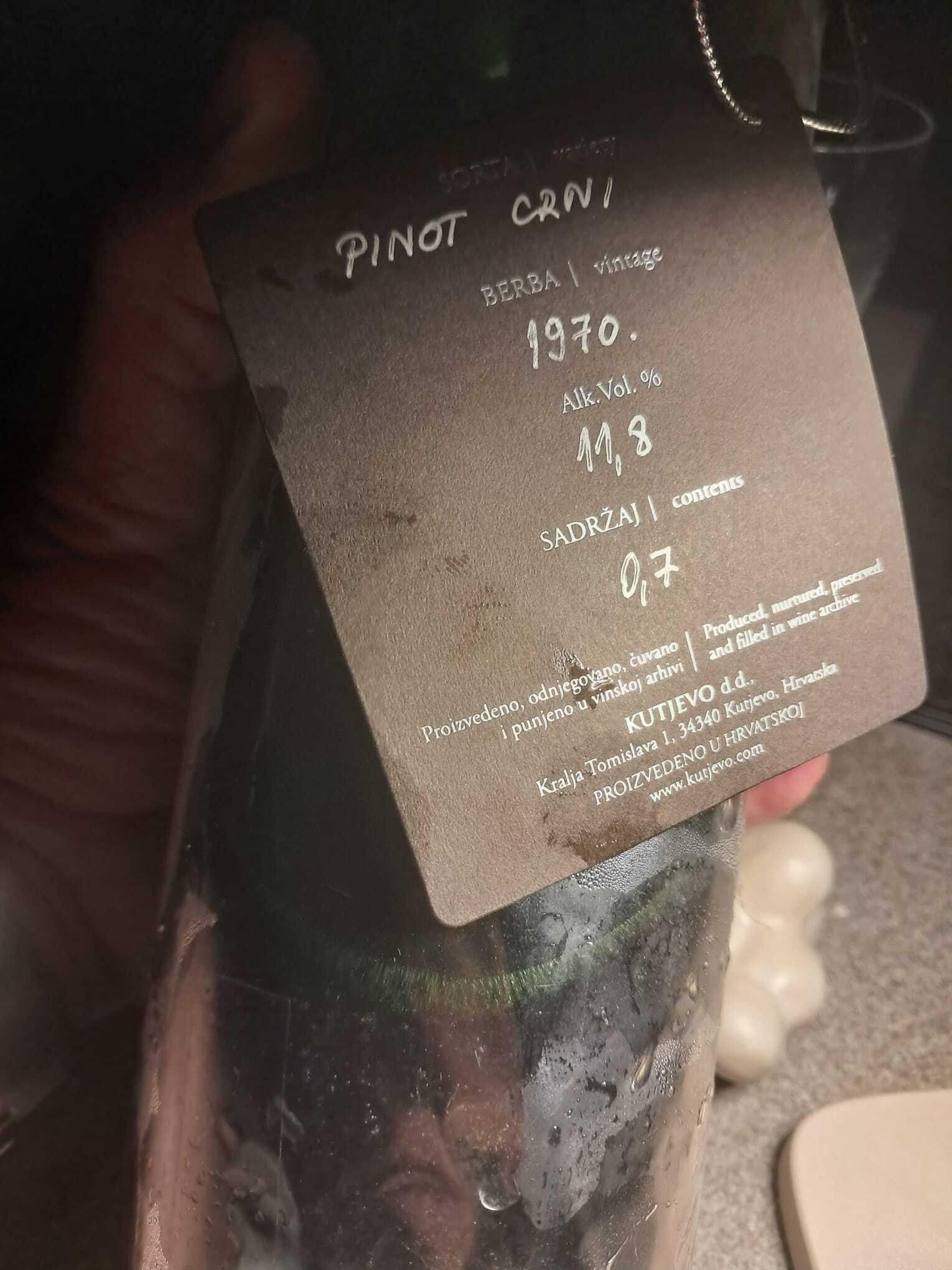 "A sad ćemo se pinkicu još kalat doli po godinama", izgovara sommelier Vukšić, donoseći za stol bocu Pinota crnog Kutjevo 1970! Prašnjav miris vina odaje starost: katran, bitumen, koža… No okus je - bomba! Više od pola stoljeća star pinot noir iz Slavonije jako se dobro drži i, unatoč manjku elegancije, u ustima pokazuje izrazitu živost.