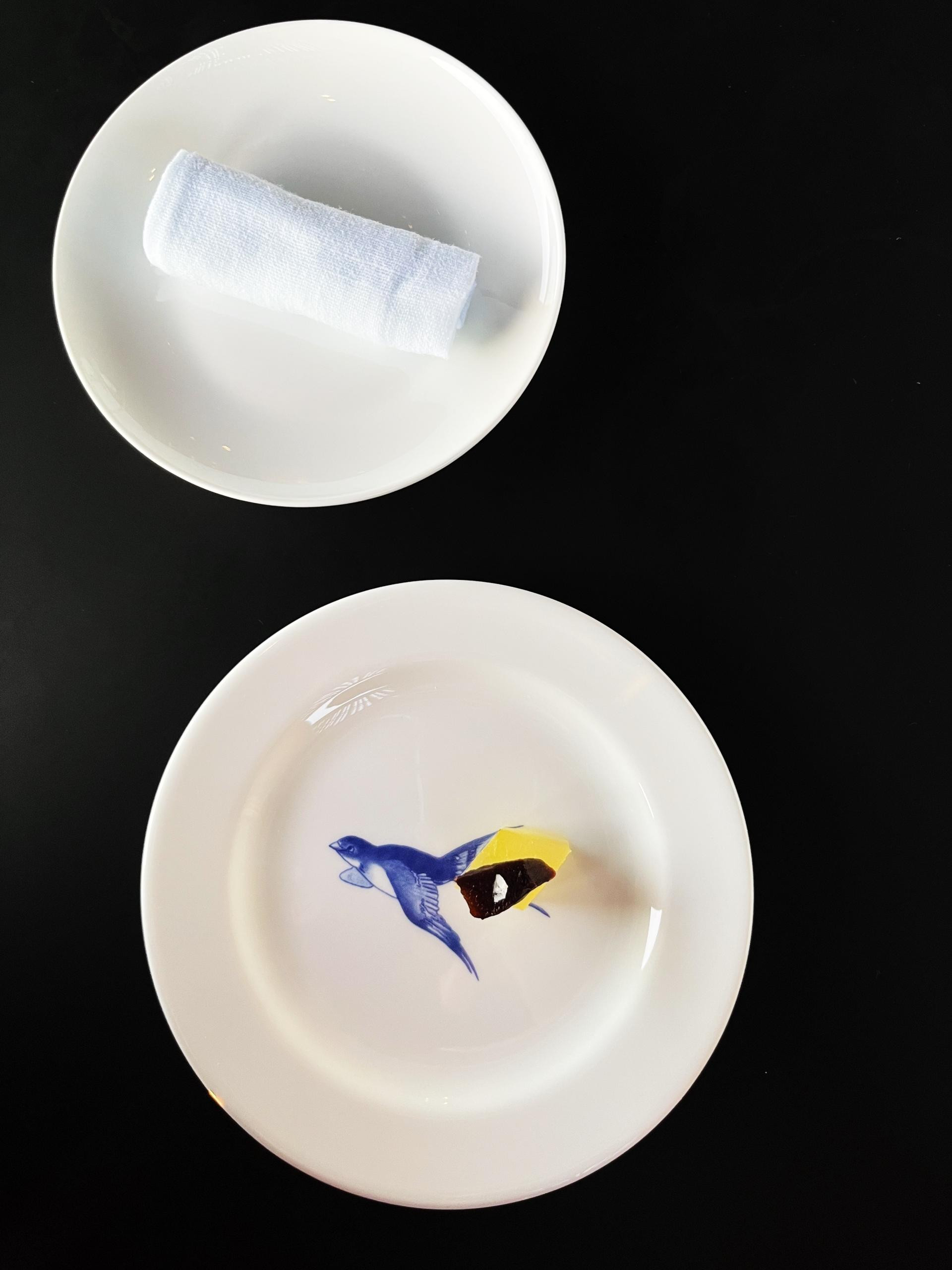 Večeru smo počeli s malim zalogajem koji je spajao jabuku s odležanom jabukom i bazgom i koji nam je svojom svježinom i lepršavošću očistio nepce. Zatim je na red stigla kozja brada umotana u shiso i poslužena sa sokom od rajčice. Na tanjuru su bile dvije rolice, tamnija i svjetlija, s time da nam se svjetlija svidjela više, jer je bila laganija, ljepše aromatična. Sve zajedno bilo je prilično hrskavo, pomalo parfemasto, ali na neki neobično ugodan način, a umak od rajčice bio je zgodno kiselkast, što nam se posebno svidjelo.