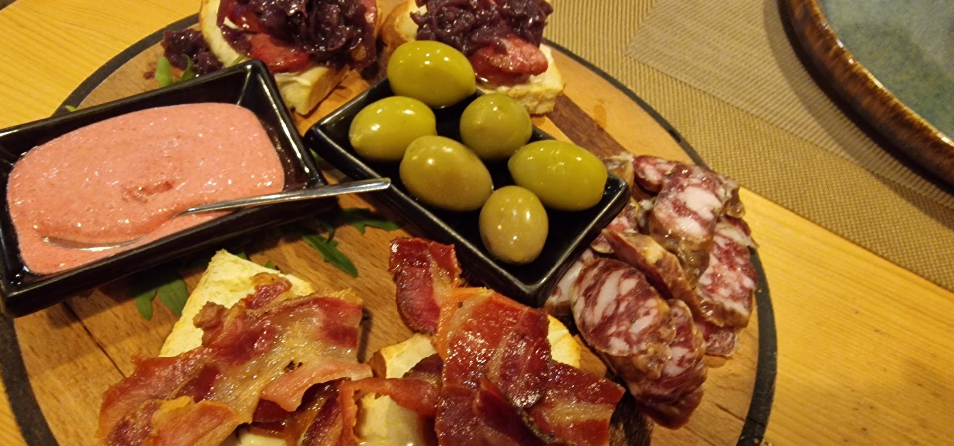 Probali smo lozu i rakiju s aromom kadulje ili, kako bi u Istri rekli, kuša. Izrazito fine arome loze i kuša otvorile su nam apetit pa smo za predjelo odabrali platu s brusketima i kobasicom od tovara. Brusketi su bili od domaćeg kruha, prhki, ne prepečeni, jedni s goronzolom, medicom i pancetom te drugi s namazom od češnjaka, domaćim kobasicama i marmeladom od žbule (luka). Okusi su dobro posloženi, češnjak i marmelada od luka fino ističu aromu istarske kobasice, jedino je panceta bila malo jače prepržena pa je ta brusketa bila malo preslana.