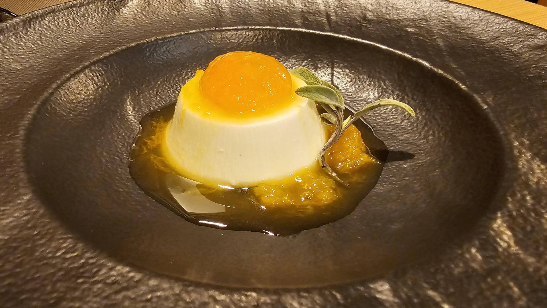 Mjesta nam je ostalo još za biftek, odležan na suhom zrenju 28 dana, idealno pečen na gradeli s kamina, medium rare po našoj želji, uz preljev s aromom kadulje za svaku preporuku. Za desert smo naručili pannacotu s breskvom. Lagana, ne preslatka, prekrasna kombinacija orašastih plodova i kompota od breskve uz, pogađate, rakiju s aromom kuša.