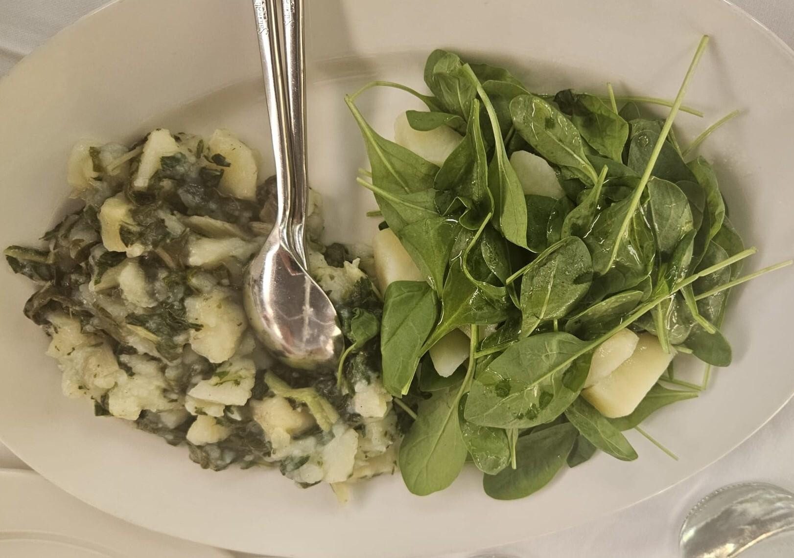 Prilozi su bili prateći vokal, ali s razumijevanjem tanjura ispred sebe. Blitva s krumpirom (4 €) bila je klasična, ali oplemenjena trunkom maslaca koji je dao dubinu, ne zagušivši melodiju. Mladi špinat s kuhanim krumpirom (4 €) bio je skromniji i slabije promišljen prilog s velikim potencijalom.