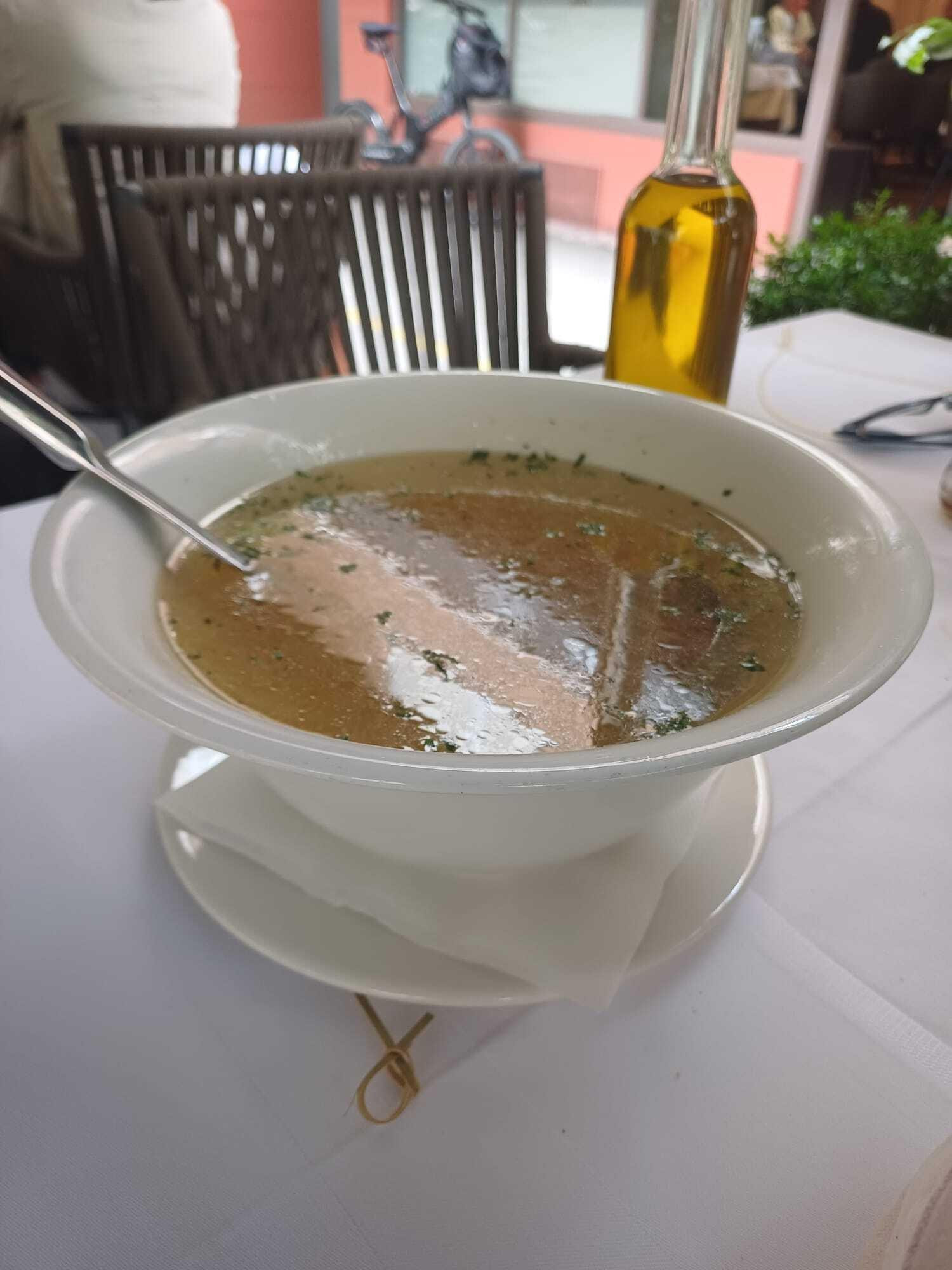Nakon futurističnog biranja sjeli smo u vremenski stroj odabirom bistre riblje juhe (4 €) koja je bila taman toliko slana s par zrna riže da podsjeti na tradiciju, ali ne i da preuzme cijeli dojam.