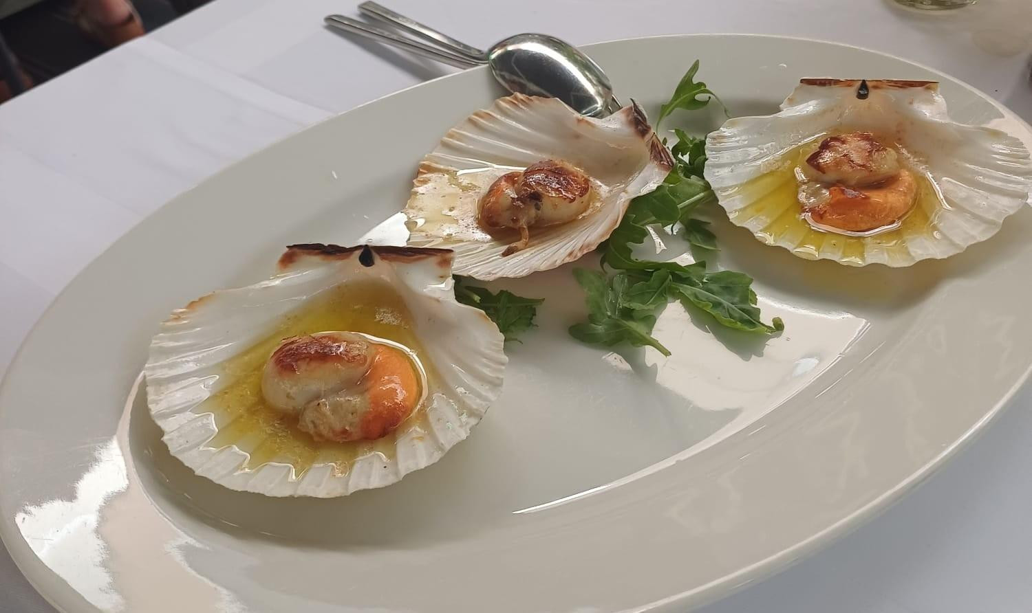 U trenutku kad nas je monotona rikola počela umarati, naručili smo jakobove kapice na žaru s maslacem (15 €). Jelo koje vraća vjeru u dekadenciju: školjke zapečene s vanjske strane, podatne iznutra, u bogatoj kupki maslaca. Ovo nije bio tek slijed, ovo je bio topli zagrljaj iz kuhinje.