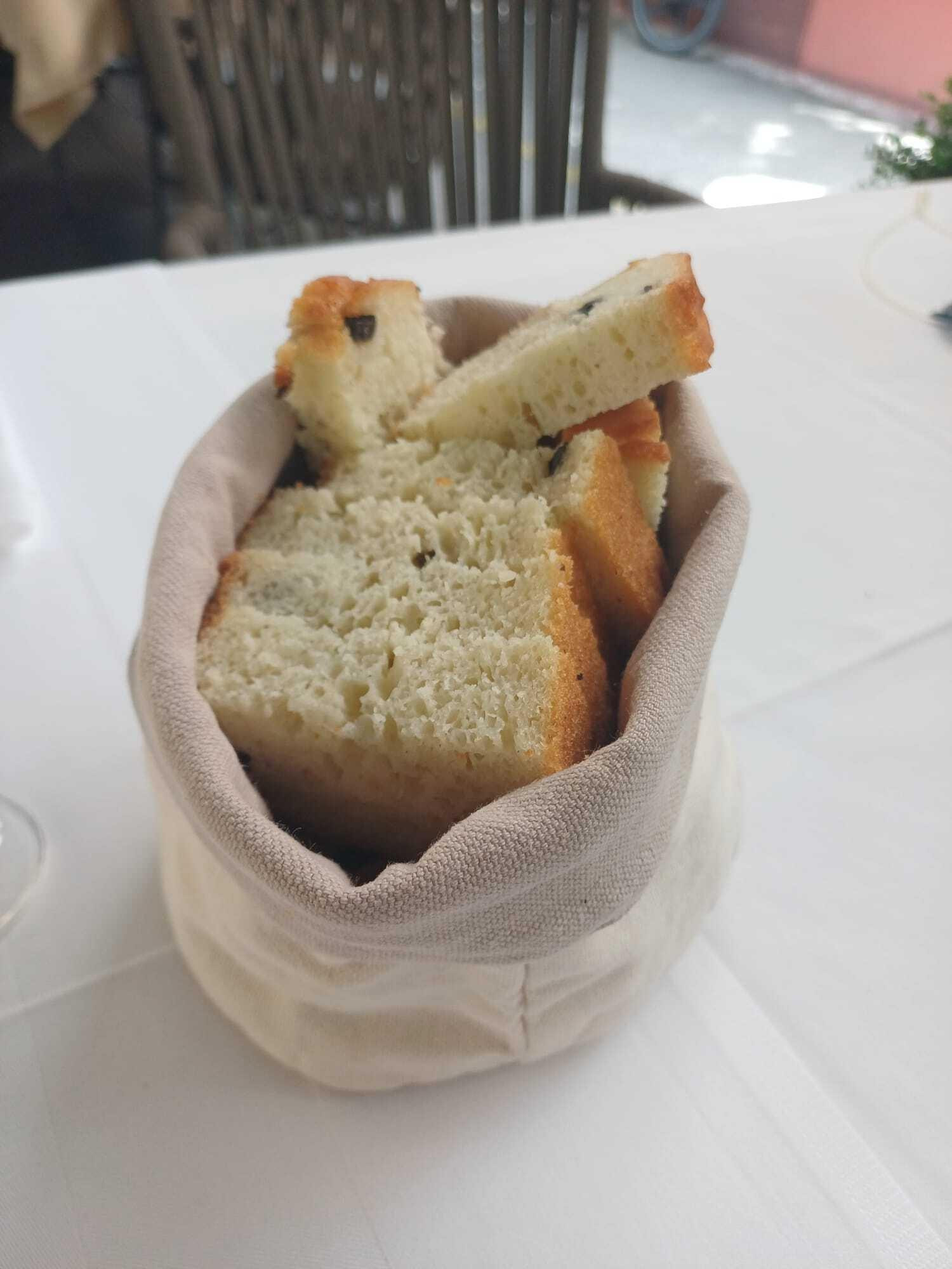 Ručak u Zlatnoj školjci započeli smo šljivovicom sa suhim smokvama (3 €), klasičan trik koji uvijek pali kad želite pomiriti kontinent i obalu. Stigla je i pašteta od bakalara (3,50 €), korektna, ali masna, s ribom tek kao sjenom u gustoj teksturi koja više podsjeća na maslac nego na more. Srećom, kućni kruh s crnim maslinama vratio je ravnotežu: topao, slan, i savršeno mekan.