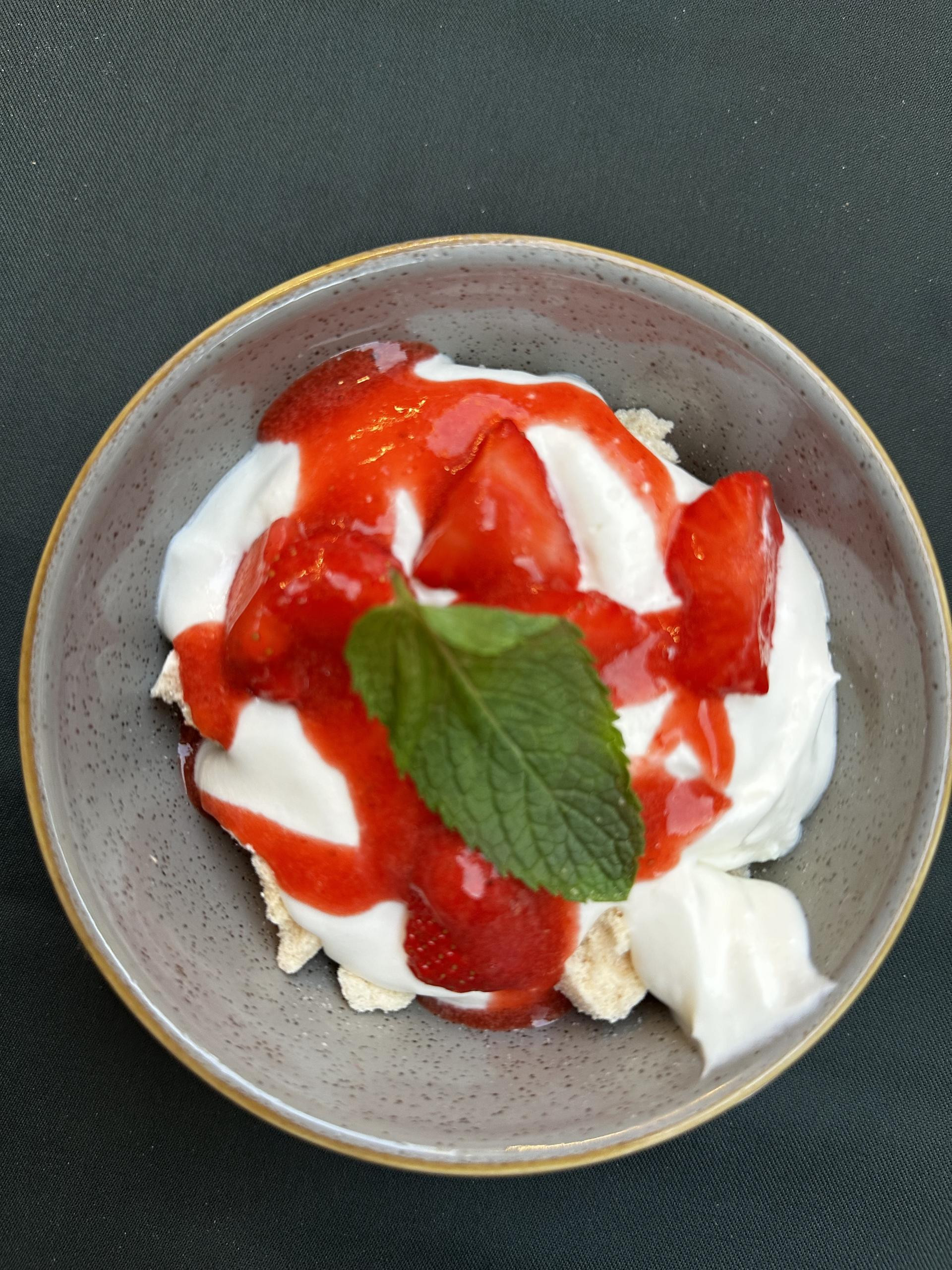 Za desert odabrali smo meringue kore s mascarpone kremom i svježim jagodama. Klasična kombinacija koja funkcionira baš zato što ne pokušava biti ništa drugo. Lagano, prozračno i idealno za završetak večere s više sljedova i tanjurima koji su dupkom puni.