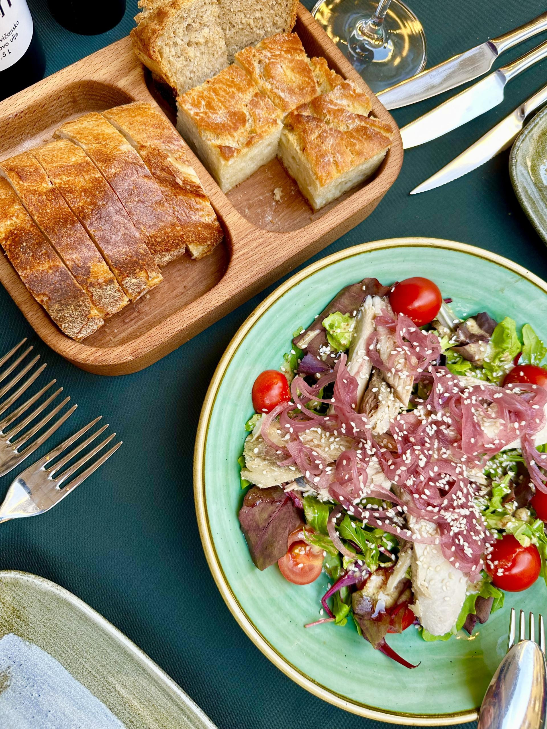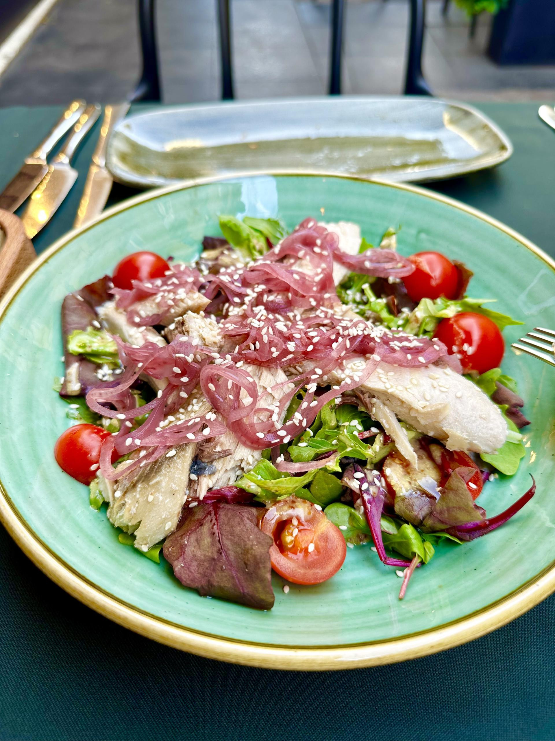 U isto vrijeme stigla nam je i salata od palamide s dressingom od meda i senfa te sjemenkama sezama (13 €). Riba je u salati bila dominantna i obilna, što nas je ugodno iznenadilo, a sam tanjur ostavljao je dojam ozbiljne vrijednosti za uloženi novac. Balans slatkog i slanog, hrskavost sezama i precizno filetirana riba činili su ovo jelo izuzetno ugodnim, nemamo zamjerke.