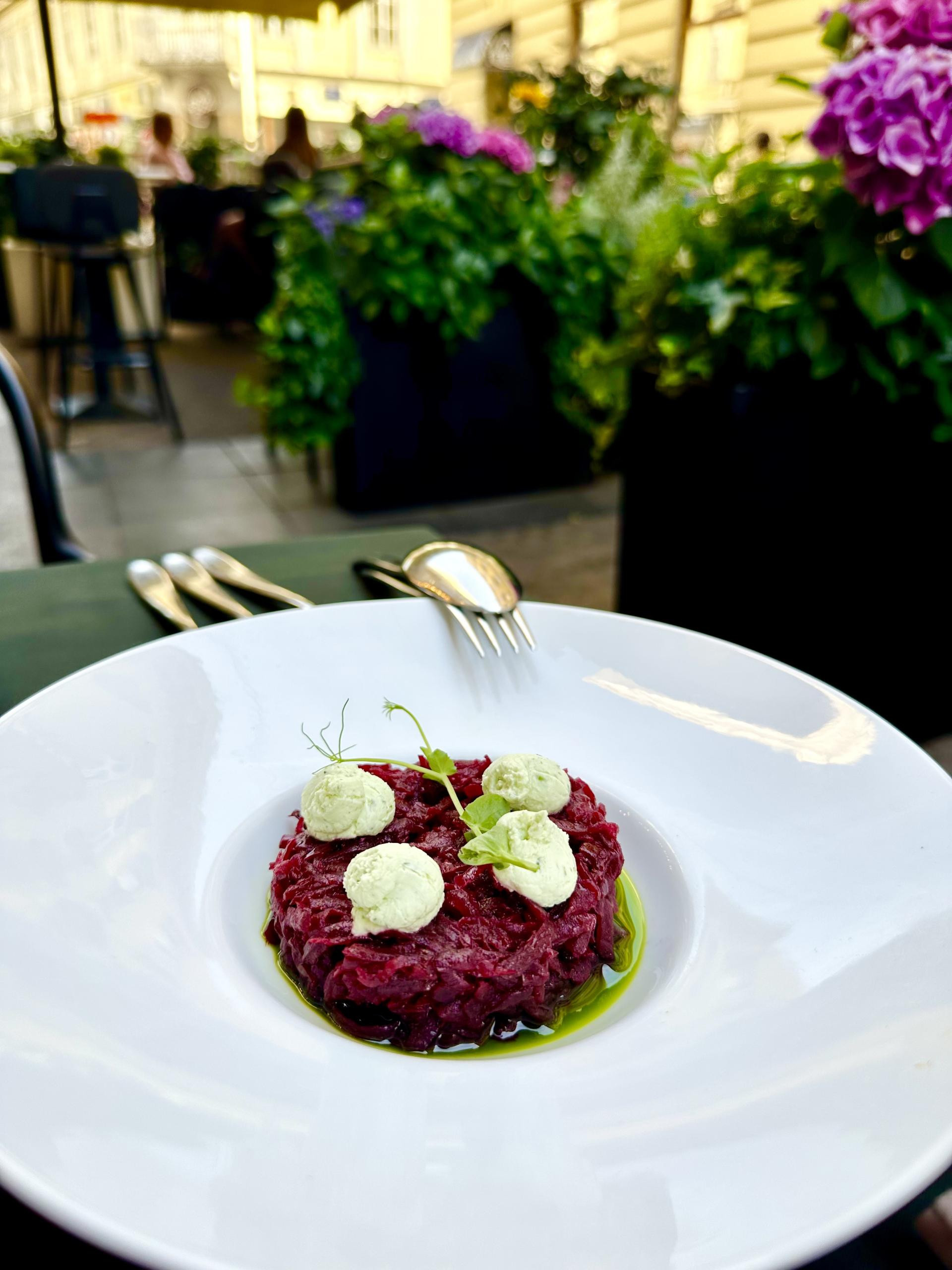 Za početak smo se odlučili za tartar od cikle s kremom od sira, vlascem, pinjolima i uljem od bosiljka (9,50 €). Ovo jelo, premda na prvi pogled skromno, pokazalo se izuzetno skladnim – svježe, elegantno i iznenađujuće punog okusa. Uz dozu teksturalne igre (hrskave cikle i kremastog sira), tartar je bio doista dostojna zamjena (ili čak konkurencija) klasičnom bifteku, nije nam bilo nimalo žao što smo donijeli ovu odluku, napravili bismo to ponovno.
