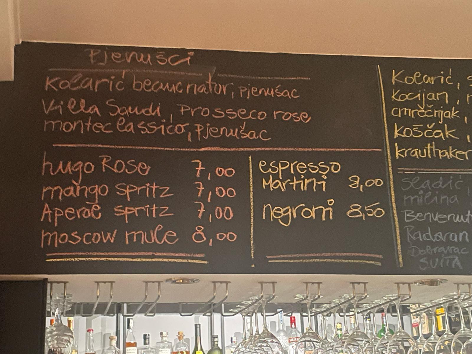 Dok smo uživali u jelima, stranac za šankom promatrao je kredom ispisanu, uzbudljivu i raznovrsnu ponudu pića tražeći svoju novu omiljenu etiketu vina, a par bez rezervacije očajnički je pokušavao dobiti stol, što dodatno svjedoči popularnosti ovog mjesta koje spaja zagrebačku spontanost s internacionalnom vibrom.